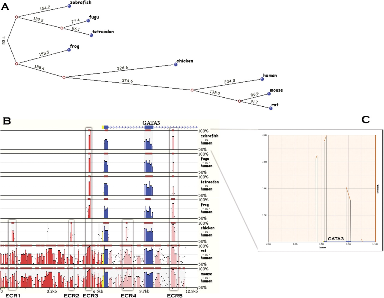 Mulan phylogenetic tree (A) and sequence conservation profile (B) for the GATA3 gene locus from human, rat, mouse, chicken, frog, and three fish genomes. Each tree branch indicates the number of nucleotide substitutions from the closest node. Noncoding ECRs conserved (>70% identity; >80 bp) in at least four species (including human) are shaded and numbered ECR1–5. Coding exons are in blue, UTRs in yellow, intergenic elements in red, and intronic in pink. ECRs are depicted as dark red bars above each pairwise alignment. Repetitive elements are depicted as green boxes on the bottom axis. Alignments resulting from the reverse strand are shaded in gray, and blocks on the forward and reverse strands can be visualized in a dot-plot between the zebrafish and the human local alignment (C).
