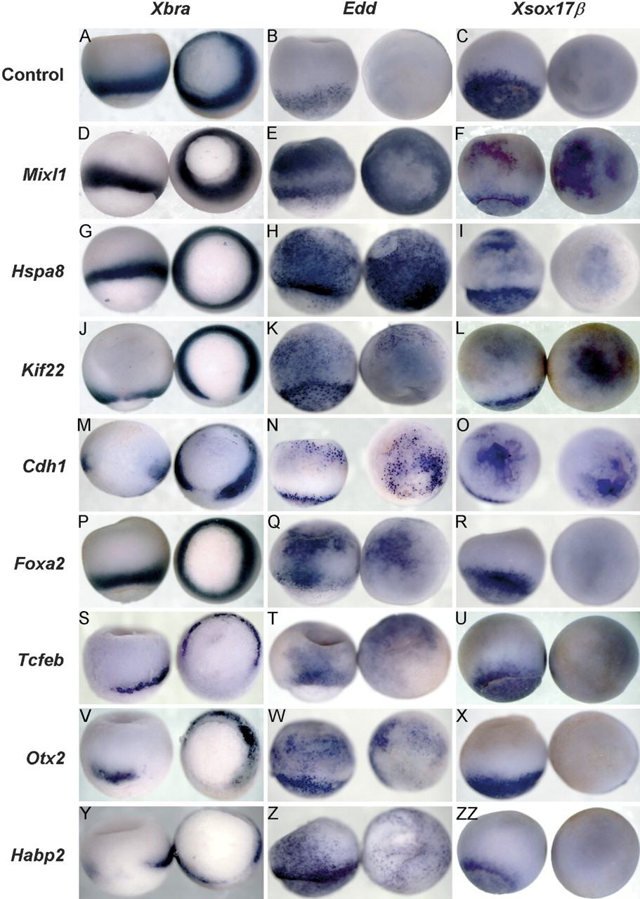 Positive clones that cause ectopic formation of endoderm or mesoderm in whole embryos. Gastrulating Xenopus embryos expressing positive clones were analyzed for the expression of Xbra (A,D,G,J,M,P,S,V,Y), Edd (B,E,H,K,N,Q,T,W,Z), or Xsox17β (C,F,I,L,O, R,U,X,ZZ). Identities of clones are listed at left and include Mixl1 (D-F), Hspa8 (G-I), Kif22 (J-L), Fzr1/Cdh1 (M-O), Foxa2 (P-R), Tcfeb (S-U), Otx2 (V-X), and Habp2 (Y-ZZ). (A-C) Uninjected controls. Concentrations of mRNAs injected into embryos are as follows: Mixl1 (D,F: 1 ng; E, 333 pg), Hspa8 (G-I: 1 ng), Kif22 (J,L: 200 pg; K, 100 pg), Fzr1 (M-O: 200 pg), Foxa2 (P-R: 200 pg), Tcfeb (S: 600 pg; T,U: 1 ng), Otx2 (V: 500 pg; W: 1 ng; X: 200 pg), Habp2 (Y: 200 pg; Z: 1 ng; ZZ: 400 pg). Embryos are oriented in Xbra column with left embryo vegetal hemisphere (endoderm) facing the bottom of the page, and right embryo vegetal hemisphere (endoderm) facing out. Embryos are oriented in both Edd and Xsox17β columns with left embryo vegetal hemisphere (endoderm) facing the bottom of the page and with the right embryo animal hemisphere (ectoderm) facing out.