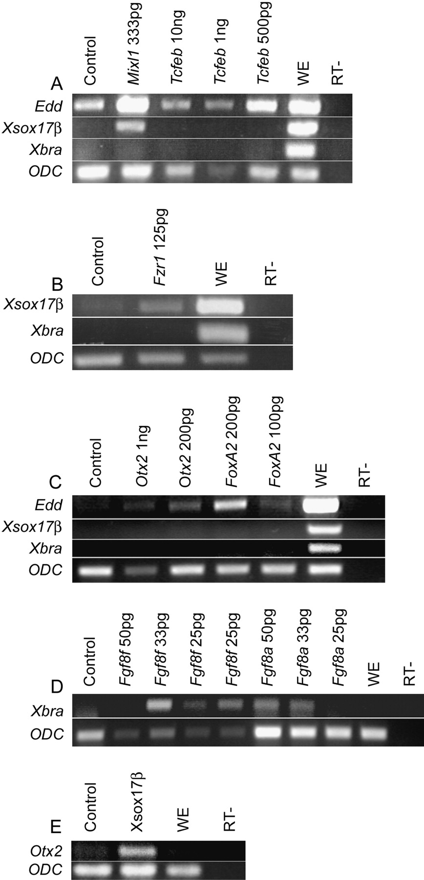 Identified molecules can directly induce endoderm or mesoderm from naive ectoderm. Capped synthetic mRNAs were injected at the indicated concentrations into the prospective ectoderm of the onecell Xenopus embryo. The ectoderm was explanted and cultured in isolation until stage 10.5. Analysis of mesodermal and endodermal markers was performed by RT-PCR on the expressing tissues and uninjected controls. Mixl1 was capable of directly inducing both Xsox17β and edd, while Fzr1 could induce Xsox17β (A and B). Tcfeb, Otx2, and Foxa2 were all able to induce edd, but not Xsox17β (A and C). FGF8a and FGF8f both induced Xbra in naive ectoderm (D). Xsox17β induces Otx2 (E). Abbreviations are as follows: WE, whole embryo; RT-, reverse transcriptase minus. ODC is a loading control.