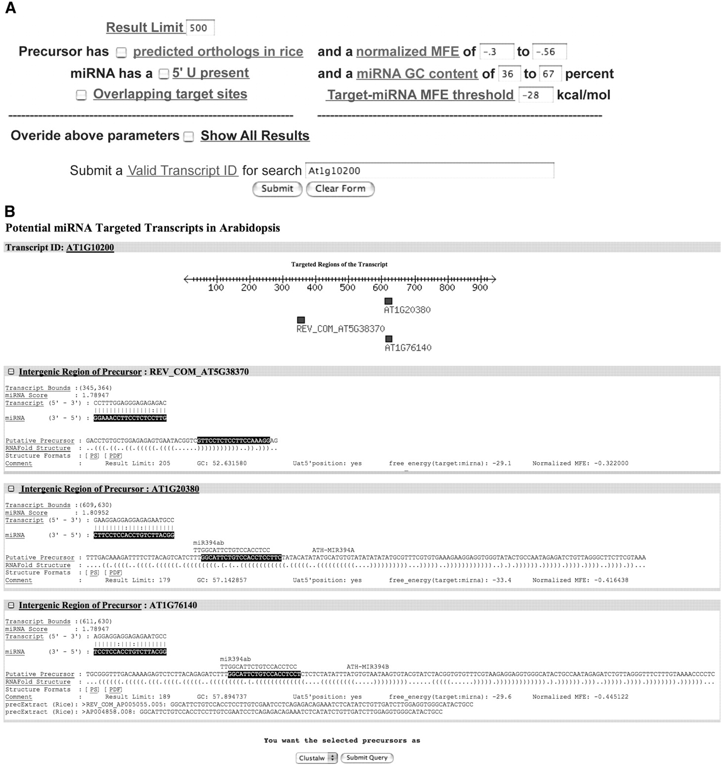 (A) Web site entry panel for query transcript At1g10200, with default precursor and miRNA parameter options. (B) Output from above query. (Graphic) Shows a map of the query transcript, below which is marked the positions of potential target sites (filled squares). These are labeled with the intergenic regions containing the precursor candidate loci from which the predicted miRNA candidates originate. The two labels on the right of this map, At1g20380 and At1g76140, correspond to the two cand2 loci that have Rfam names MIR394a and MIR394b, respectively. (Text) The predicted miRNA sequences are shown (white text on black), and, for comparison in this figure, the known mature miRNAs are indicated above the predicted precursors. When the `predicted orthologs in rice' box for the query options is also checked, only the At1g76140 cand2 candidate (MIR394b) record is returned. The At1g20380 cand2 candidate (MIR394a) record is not returned because the predicted miRNA for this record is 2 nt longer and does not have an exact match in rice. Boxes on the left can be checked and the precursor candidates aligned with ClustalW or downloaded in fasta format using the option shown below the listed candidate records.