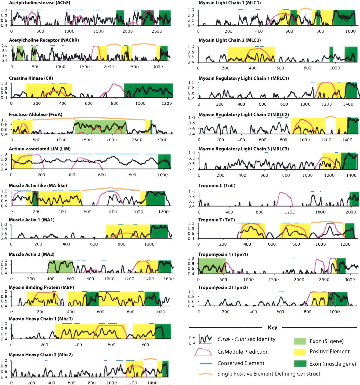 Summary of functional and computational annotations at each of the 20 loci. The key is the same as in Figure 2, except that detailed functional annotations are omitted (for those, see Supplemental Fig. 2). Here, light green shading represents exons from neighboring genes, and position 0 is the position of the forward primer for the original construct. Orange bars link PEs that have internal deletions from the original functional constructs and are therefore noncontiguous on the identity plot.