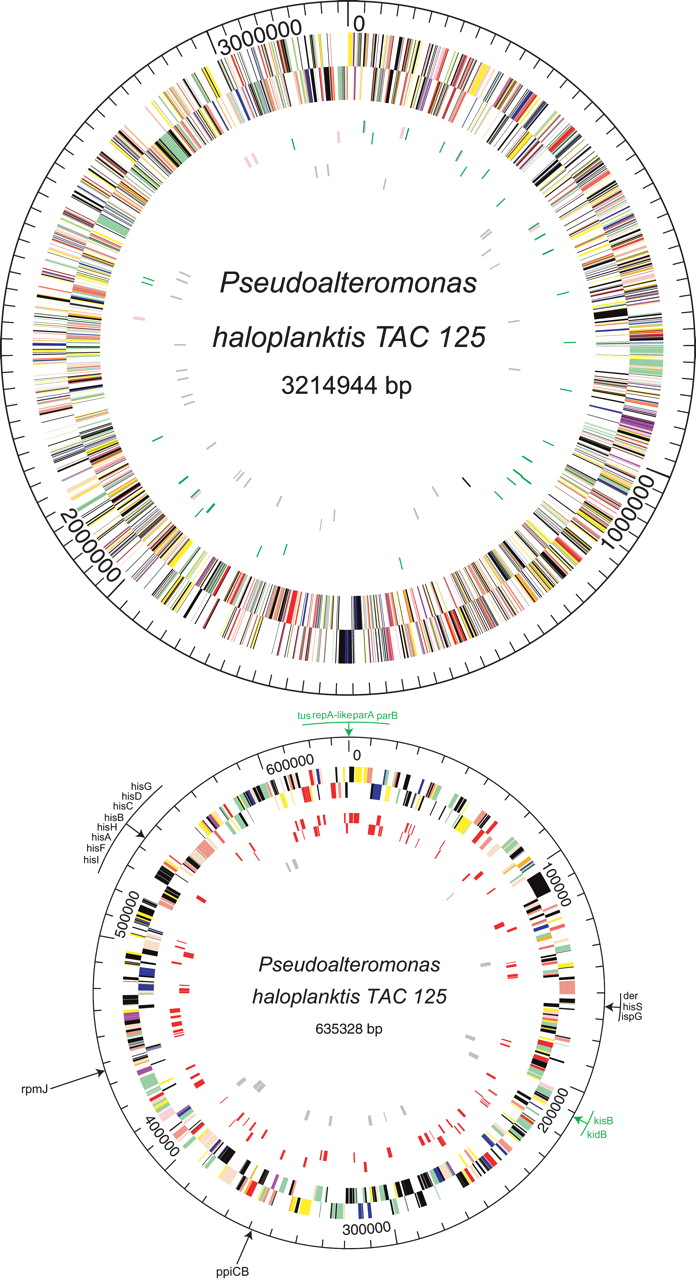 Circular representation of the Pseudoalteromonas haloplanktis genome. Circles display (from the outside): (1) predicted coding regions transcribed in the clockwise direction; (2) predicted coding regions transcribed in the counterclockwise direction. Genes displayed in 1 and 2 are color-coded according to different functional categories: salmon indicates amino acid biosynthesis; orange indicates purines, pyrimidines, nucleosides, and nucleotides; purple indicates fatty acid and phospholipid metabolism; light blue indicates biosynthesis of cofactors, prosthetic groups, and carriers; light green indicates cell envelope; red indicates cellular processes; brown indicates central intermediary metabolism; yellow indicates DNA metabolism; green indicates energy metabolism; pink indicates protein fate/synthesis; blue indicates regulatory functions; grey indicates transcription; teal indicates transport and binding proteins; and black indicates hypothetical and conserved hypothetical proteins. (3) tRNAs (green) and rRNA (pink) on chrI/genes similar to phage proteins (red) on chrII; (4) and tonB and tonB-like genes in grey. Chromosome II gene names similar to that of the R1 plasmid replication apparatus (unidirectional) are colored in green.