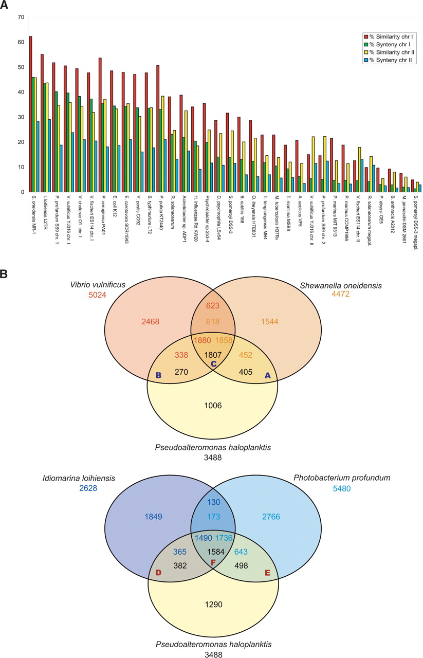 Putative orthologs and syntenies between the genome of P. haloplanktis and the genome of related bacteria. The alphabetic letters A to F refer to the Supplemental Table 4 (T4, A to F). (A) The percentage of P. haloplanktis genes homologs to a selection of 34 complete bacterial proteomes (i.e., 30% identity and a ratio of 0.8 of the length of the smaller protein to that of the larger one) is represented by red bars for chrI and by yellow bars for chrII. The percentage of P. haloplanktis genes in synteny groups with a selection of 34 complete bacterial genomes is represented by green bars for chrI and by blue bars for chrII. The closest organism is S. oneidensis. (B) Comparison of the gene content of Pseudoalteromonas haloplanktis, Shewanella oneidensis, Vibrio vulnificus, Photobacterium profundum, and Idiomarina ioihiensis. Putative orthologs are defined as genes showing a minimum of 30% identity and a ratio of 0.8 of the length of the smaller protein to that of the larger one, or as two genes included in a synteny group. The intersections between the three circles give the number of genes found in the two or three compared species. Genes outside these areas are specific to the corresponding organism. The total number of annotated genes is also given under each species name.