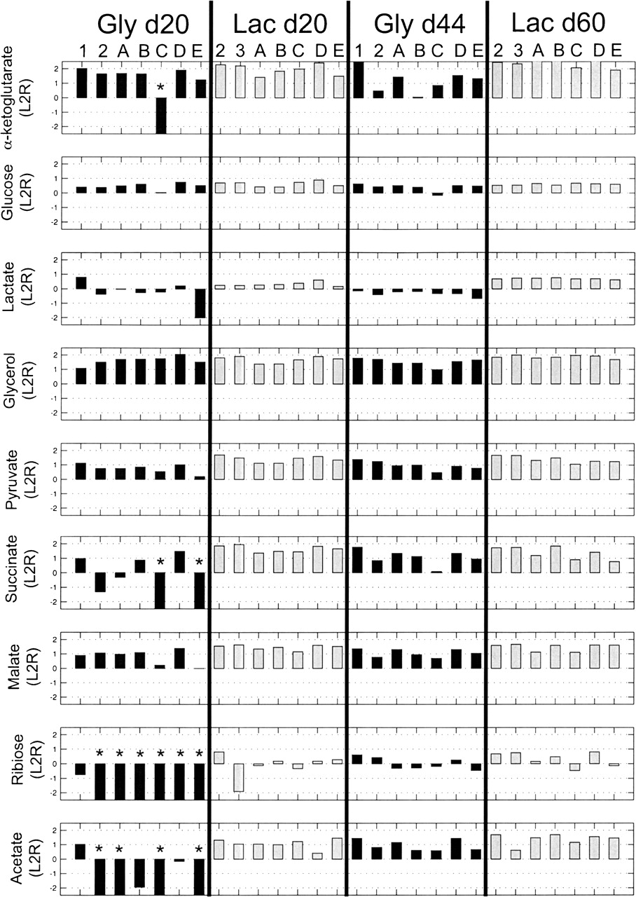 Growth rate characterization of evolution populations on nonevolutionary substrates. Columns indicate individual populations grouped by the day of evolution and evolution substrate used. Rows show the substrate used for growth rate testing. Measurements for each population were compared with the growth rate of the wild-type strain and the log2 ratio is reported to compare growth rates. An asterisk (*) indicates cases where the evolved population exhibited slow, almost imperceptible growth relative to the wild-type strain.