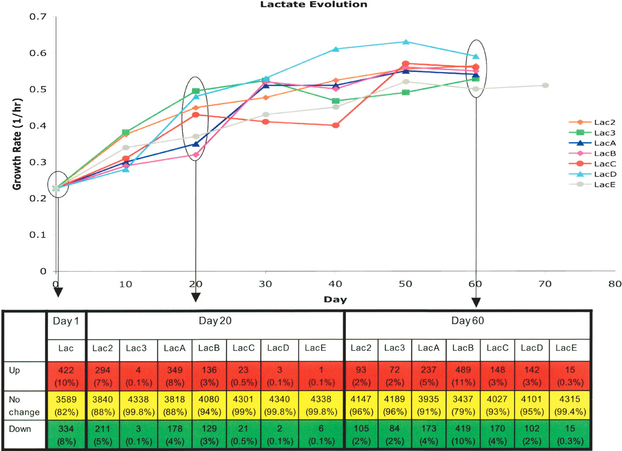 Gene expression changes in lactate evolution populations throughout the course of adaptive evolution as compared with glucose wild-type expression profile. Growth rate changes throughout evolution are shown as a function of day of evolution with expression profiling performed at days 1, 20, and 60 of evolution. Significant expression changes from the wild-type strain grown on glucose were calculated by t-test using P-value cut-off corresponding to a false-discovery rate of 5%. By this calculation, the number of genes showing statistically significant expression changes tabulated below the plot at either increased expression compared with the wild-type (Up), decreased expression compared with the wild-type (Down), or no change in expression (No change). Percentages given in each cell indicated the percentage of genes falling within the category as a portion of the total genes.