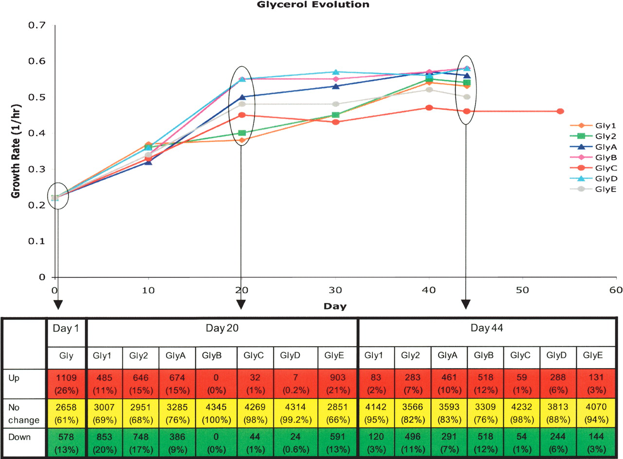 Gene expression changes in glycerol evolution populations throughout the course of adaptive evolution as compared with glucose wild-type expression profile. Growth rate changes throughout evolution are shown as a function of day of evolution with expression profiling performed at days 1, 20, and 44 of evolution. Significant expression changes from the wild-type strain grown on glucose were calculated by t-test using P-value cut-off corresponding to a false-discovery rate of 5%. By this calculation, the number of genes showing statistically significant expression changes tabulated below the plot at either increased expression compared with the wild-type (Up), decreased expression compared with the wild-type (Down), or no change in expression (No change). Percentages given in each cell indicated the percentage of genes falling within the category as a portion of the total genes.