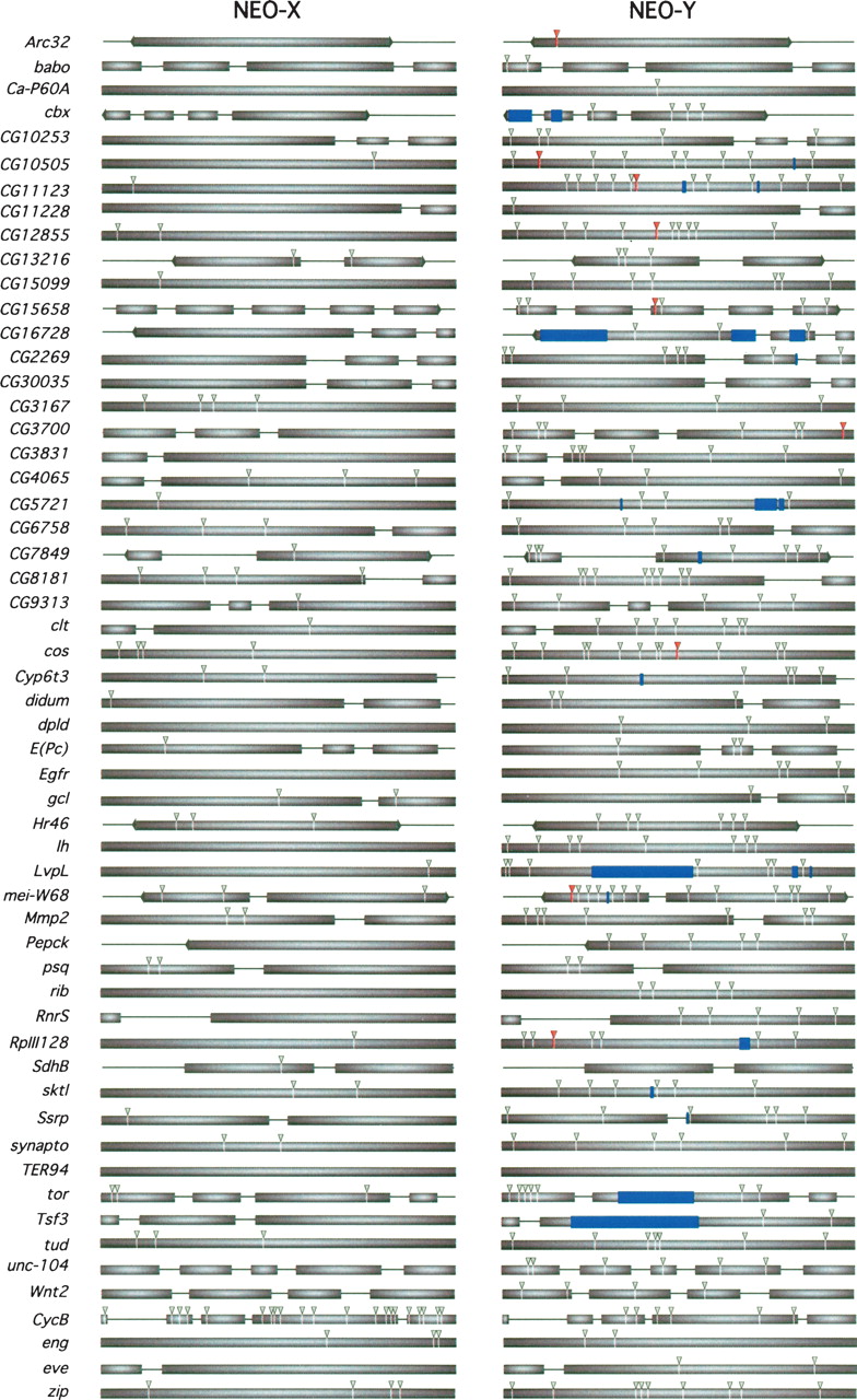 Evolution of protein-coding genes on the neo-sex chromosomes. Boxes correspond to exons (with left or right arrows corresponding to the first or last exon of a gene, respectively), and lines correspond to introns or flanking intergenic regions. Gray triangles indicate amino acid changes, blue bars represent frameshift deletions, and red triangles correspond to premature stop codons.