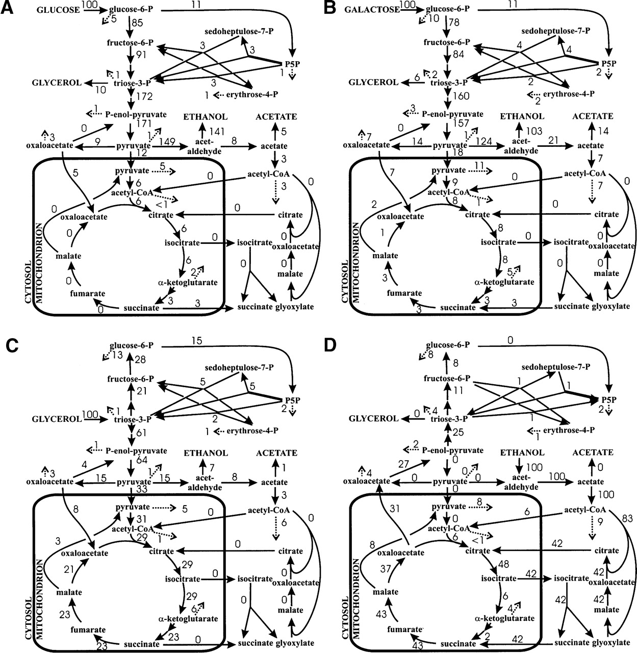 Relative distributions of absolute carbon fluxes through S. cerevisiae central carbon metabolism. Flux distributions were obtained with (A) 13C-constrained flux analysis based on the data of Blank and Sauer (2004) (glucose) and stoichiometric flux balancing with (B) galactose; (C) glycerol; and (D) ethanol. Flux values are relative to the specific substrate uptake rate.