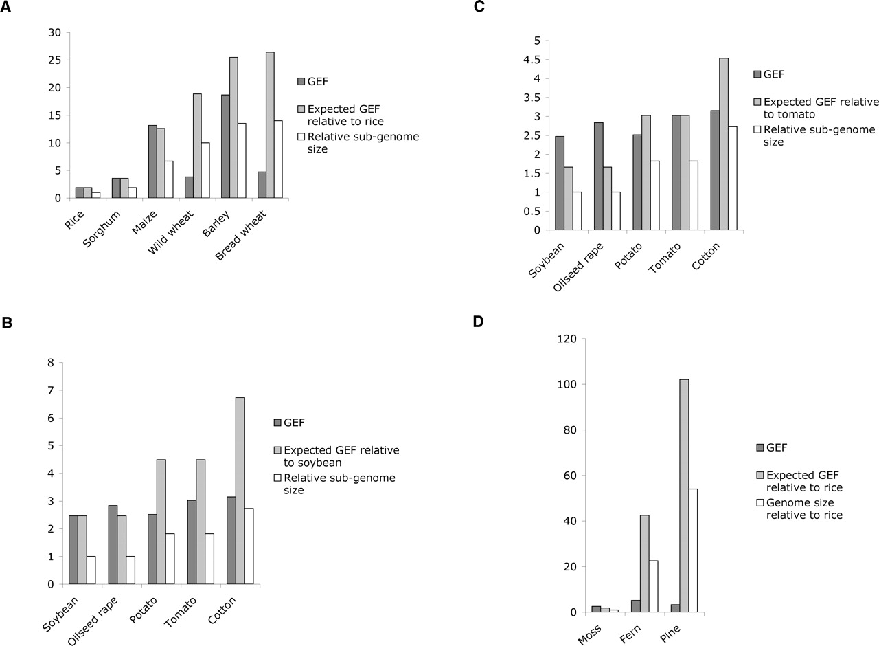 Gene enrichment for each species. (A) Monocots. The expected GEF is calculated by extrapolation of the gene frequency found in rice to a genome of the corresponding size. (B) Dicots. The expected GEF is calculated by extrapolation of the gene frequency found in soybean to a genome of the corresponding size. (C) Same as B using tomato as a reference. (D) Non-angiosperms. The expected GEF is calculated by extrapolation of the gene frequency found in rice to a genome of the corresponding size. The GEF values are listed in Supplemental Table 1, and a list of all gene matches is shown in Supplemental Table 2.