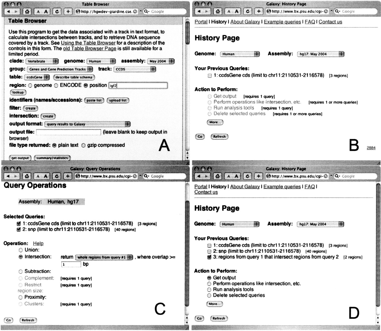 Galaxy history system for querying UCSC Table Browser. (A) UCSC Table Browser page sending results to Galaxy. (B) Galaxy's history page with a single query. (C) History page showing how Galaxy can be used to find intersection between two queries. (D) History page displaying intersection results.