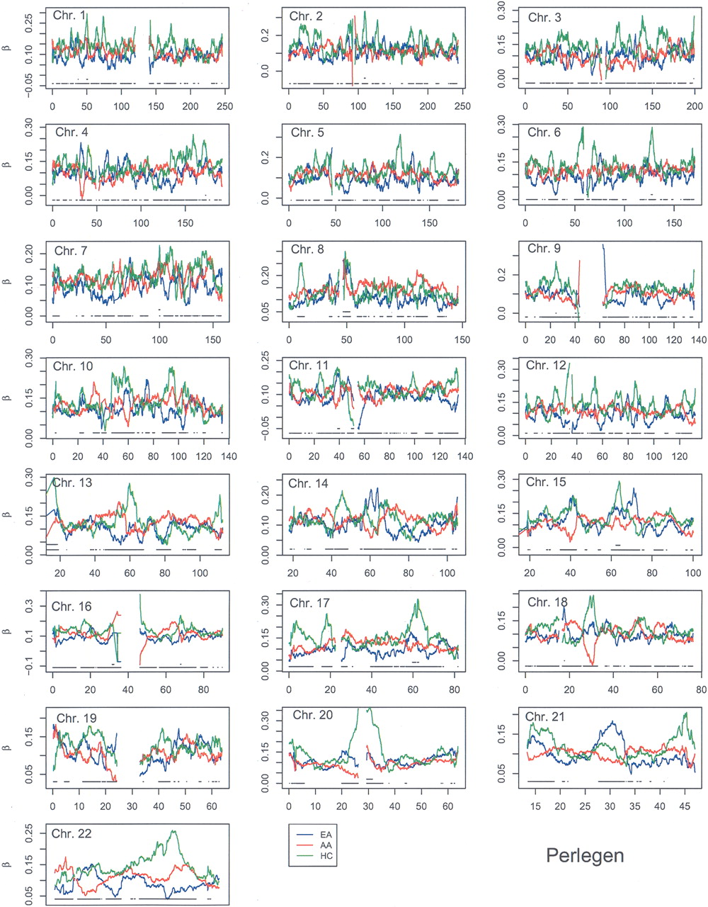 Perlegen 5-Mb window population-specific FST values. (Lower broken line) Regions where the greatest difference between population-specific values was more than three standard deviations, (upper broken line) regions where population-average values were more than three standard deviations from the mean.
