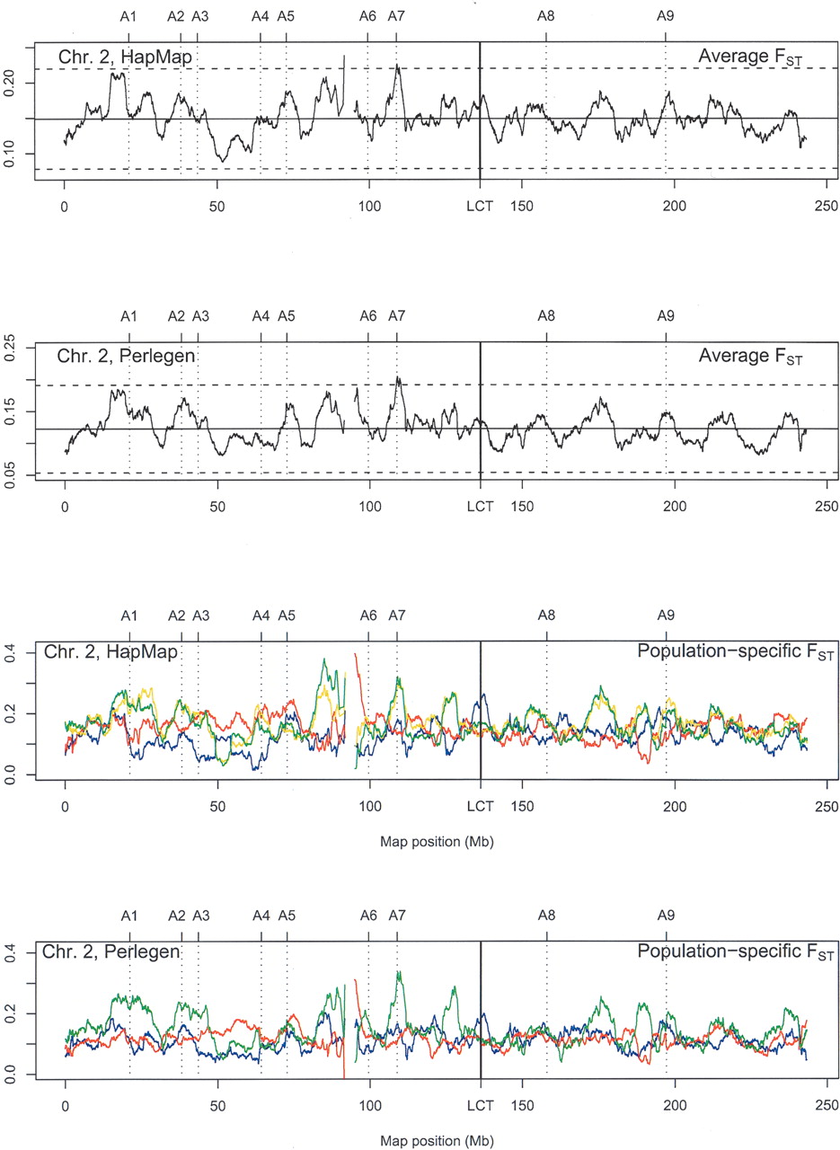 Human chromosome 2 values of FST from HapMap and Perlegen data. For population-specific values, the HapMap populations are CEU (blue), YRI (red), CHB (green), and JPT (yellow). The Perlegen populations are EA (blue), AA (red), and HC (green). The genes A1–A9 are: A1: APOB; A2: FAM82A (formerly LOC151393); A3: THADA (formerly FLJ21877); A4: PELI1; A5: SEC15L2 (formerly SEC15B); A6: REVIL; A7: EDAR; A8: GALNT5; A9: HECW2 (formerly KIAA1301) as described in Supplemental Table A of Akey et al. (2002).