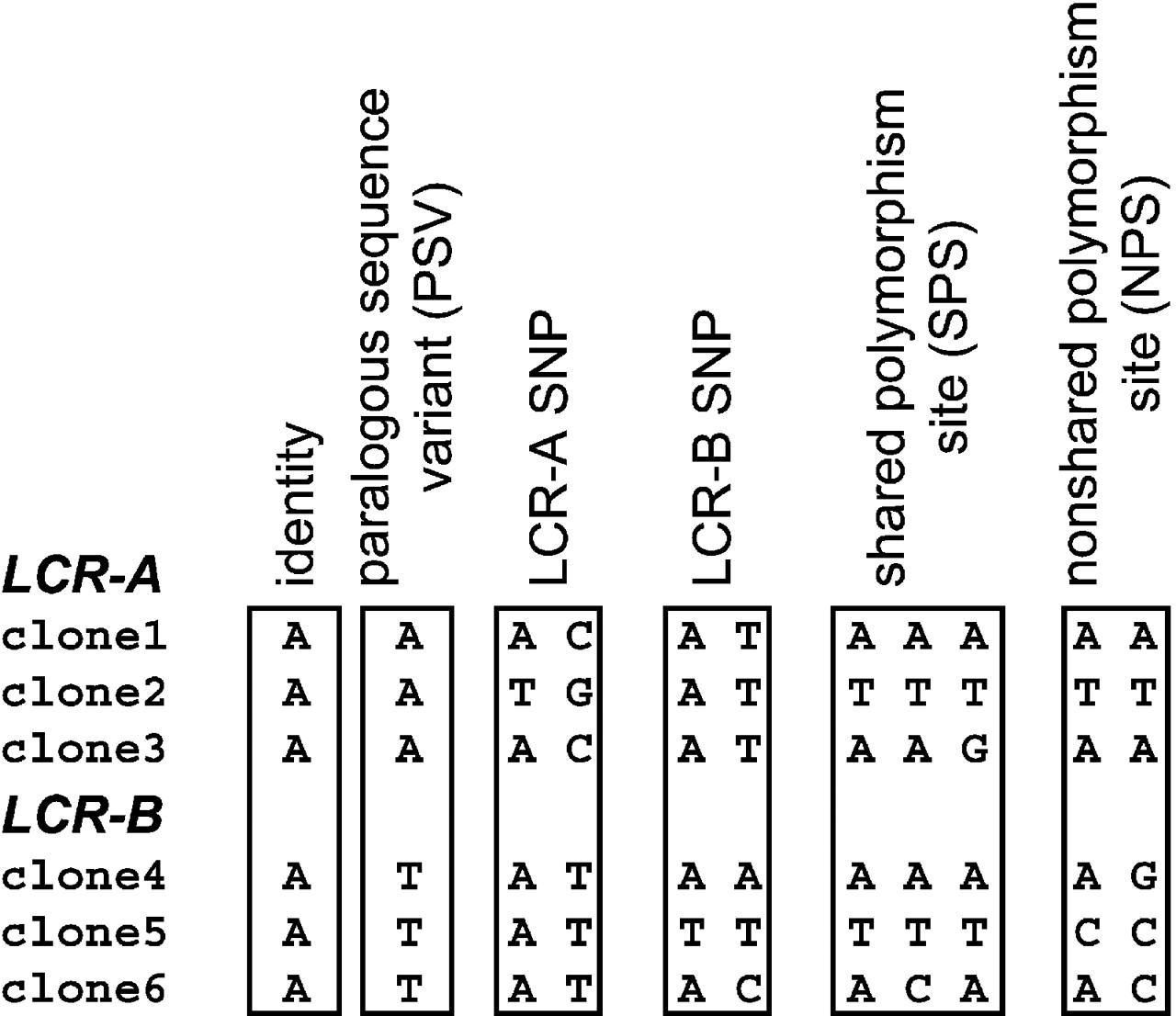 Classification of the sequence variants. Identical positions are invariant (fixed) in all clones from both LCRs. Paralogous sequence variants (PSVs) are positions invariant within each of the LCRs, but different between the LCRs. LCR-A and LCR-B SNPs correspond to positions where one LCR is polymorphic, but the second LCR is not. Shared polymorphism sites (SPSs) correspond to positions where both LCRs are polymorphic and the set of possible variants in one LCR is equal to, or contained within, the set of possible variants at the same positions in the other LCR. If both LCRs are polymorphic at a given site, but the clone variation does not overlap between the LCRs, this position is described as a nonshared polymorphism site (NPS).