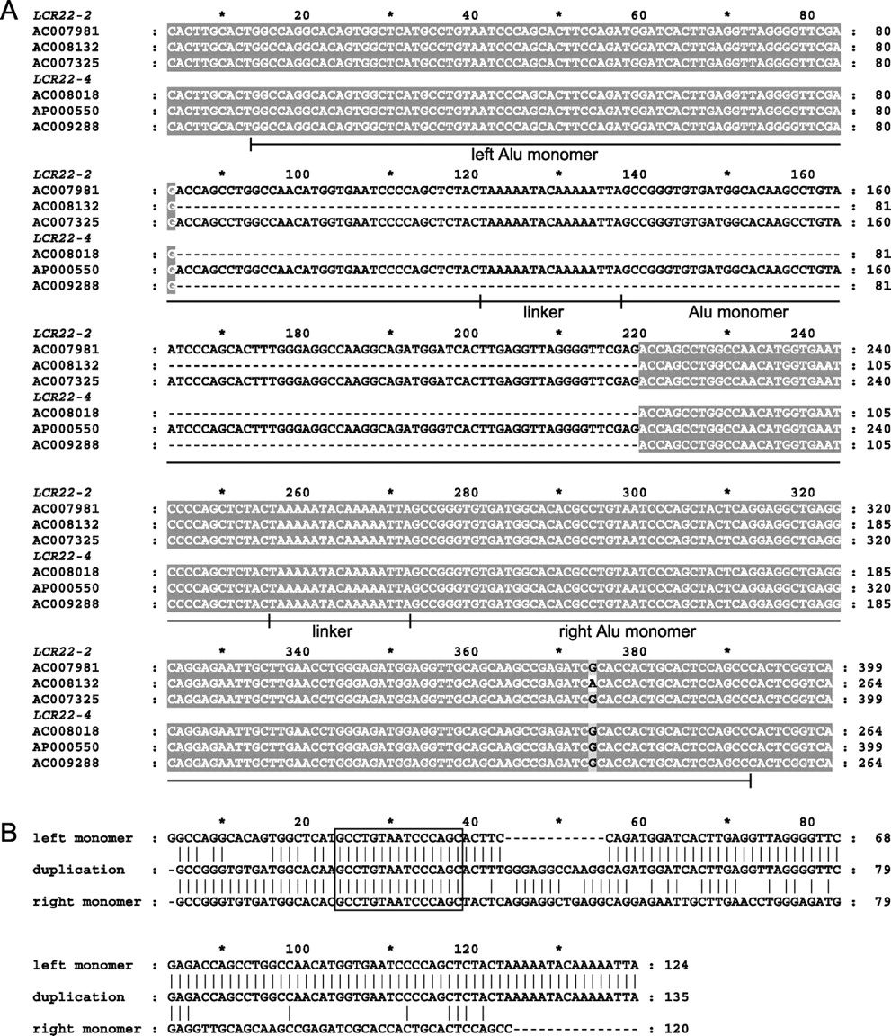 Shared polymorphism of a 153-bp-long indel between LCR22-2 and LCR22-4. (A) Alignment of the indel region from LCR22-2/LCR22-4 clones. These breakpoints correspond to positions 77473–77635 in the clone alignment (Fig. 2). LCR22-2 clone AC008132 and two LCR22-4 clones, AC008018 and AC000928, share the same gap. The rearrangement was caused by homologous recombination between two AluSx monomers and led to duplication of one Alu monomer in the middle. Alternatively, the indel could be a result of deletion in a pre-existing Alu element with a duplicated monomer. (B) Alignment of the duplication breakpoints. We compared the duplicated monomer with the two parental Alu monomers. The first 37 bp in the product is nearly identical to the right monomer. The similarity to the left monomer starts from position 27 and, with the exception of a 12-bp minideletion, continues until the end of the monomer. In a 15-bp region (boxed) the duplicated monomer is identical to both the parental monomers. The original break was probably located within this segment.