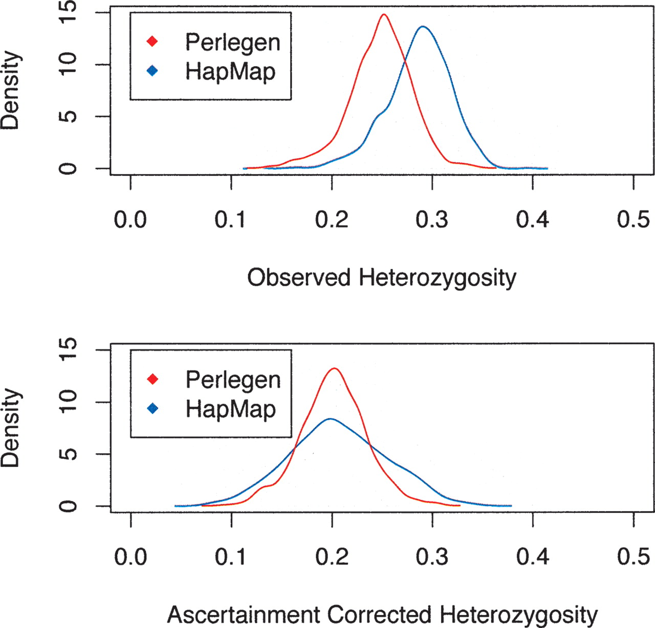 (Top) Distributions of uncorrected HS (within-population heterozygosity) for the HapMap and the Perlegen data across 5682 windows of 500 kb spanning the entire human genome. Commensurate with the upward skew to the site frequency spectrum, the HapMap data have higher heterozygosity. (Bottom) After correction for ascertainment bias, the distributions of heterozygosity are more comparable; however, the ascertainment correction appears to have inflated the variance among windows in HS.