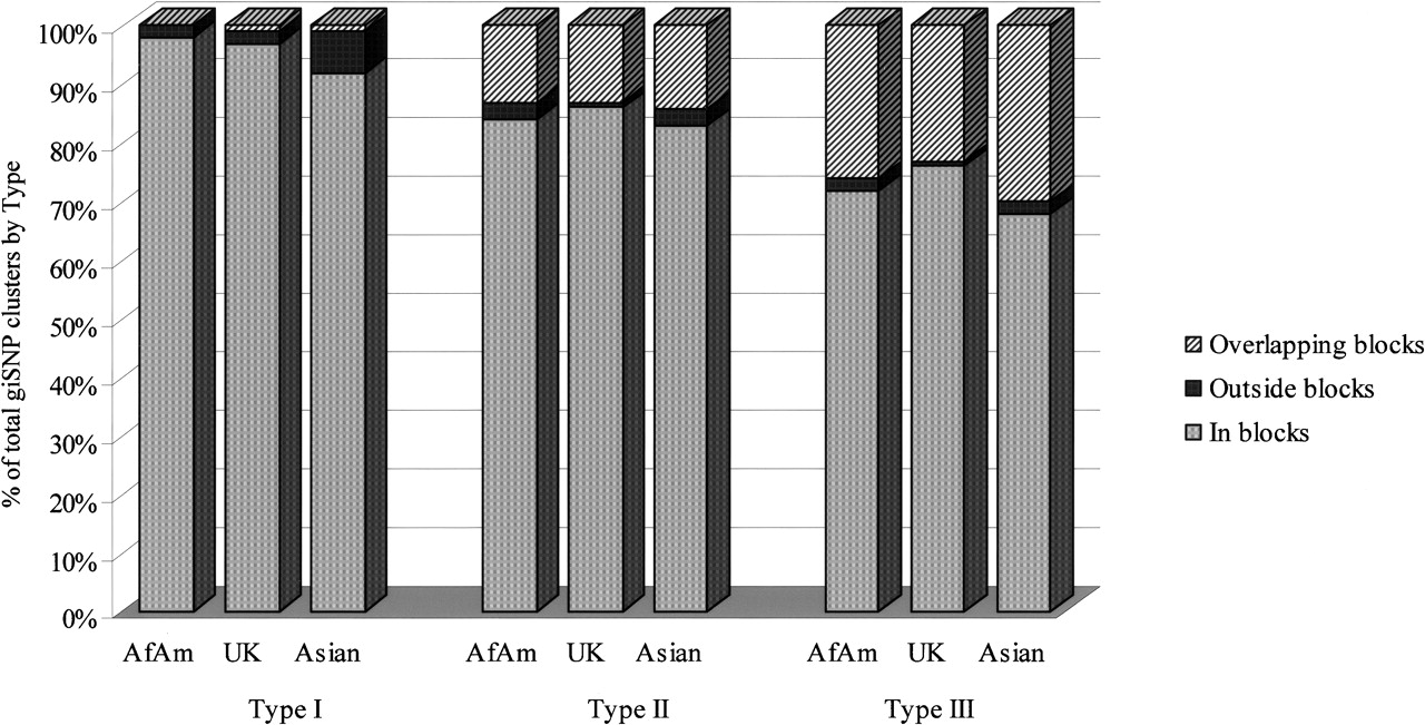 Percentage of Type I, Type II, and Type III giSNP clusters falling within, outside, or across Gabriel-defined haplotype blocks.