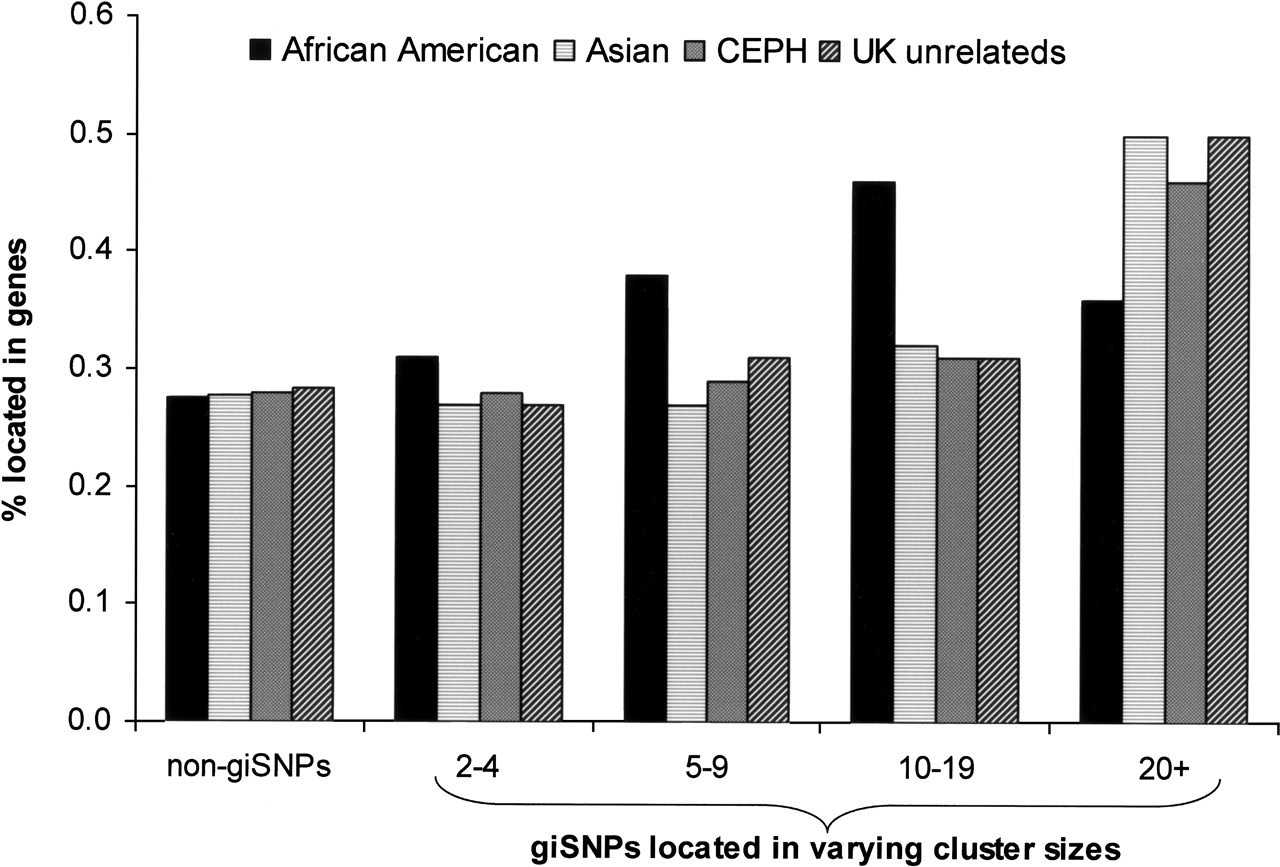 Percentage of non-giSNPs and giSNPs located within genes on chromosome 20. Percentages were calculated by scoring each SNP as either outside or inside genes from each SNP category (i.e., non-giSNPs, giSNPs from clusters containing 2–4, 5–9, 10–19, and ≥20 giSNPs).