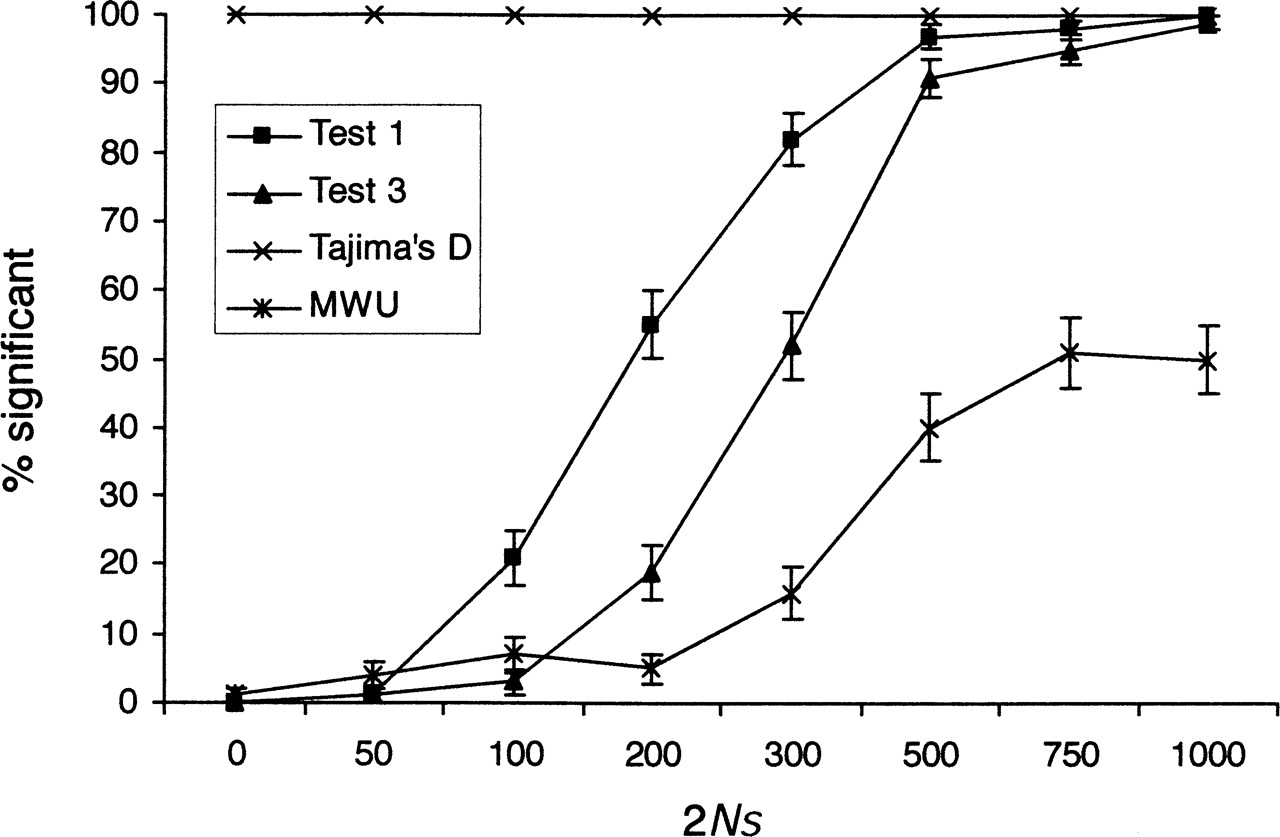 The proportion of significant results of the four different tests under population growth, when an equilibrium model is used as the null model. The simulation details are as in Figure 1, but with a 10-fold reduction in population size N generations ago. The null model assumed is a standard neutral equilibrium model without population growth.