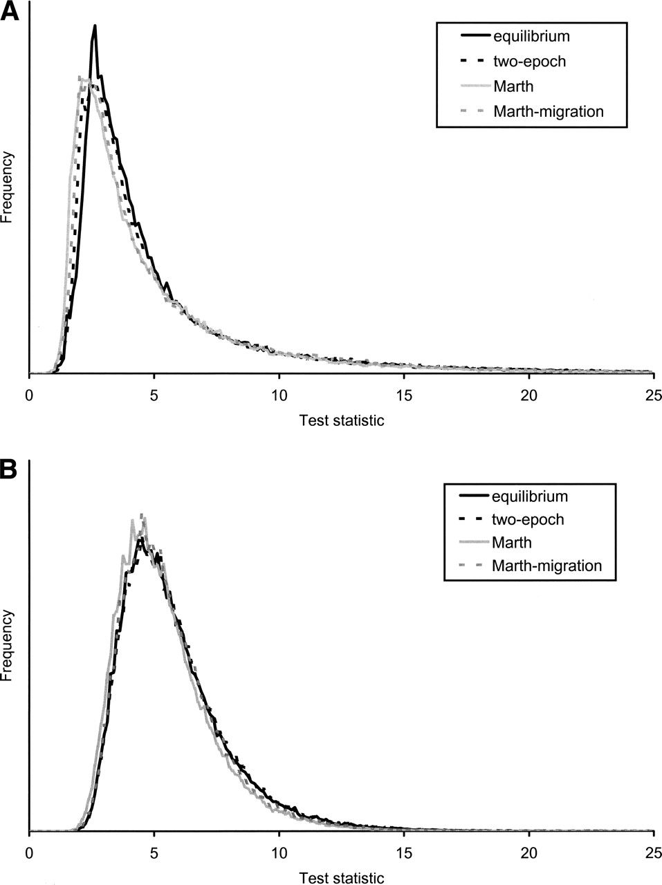 The null distribution of Test 2 different tests under different demographic models described in the text and a recombination rate of (A) 2NR = 0 and (B) 2NR =10–3 per base pair.