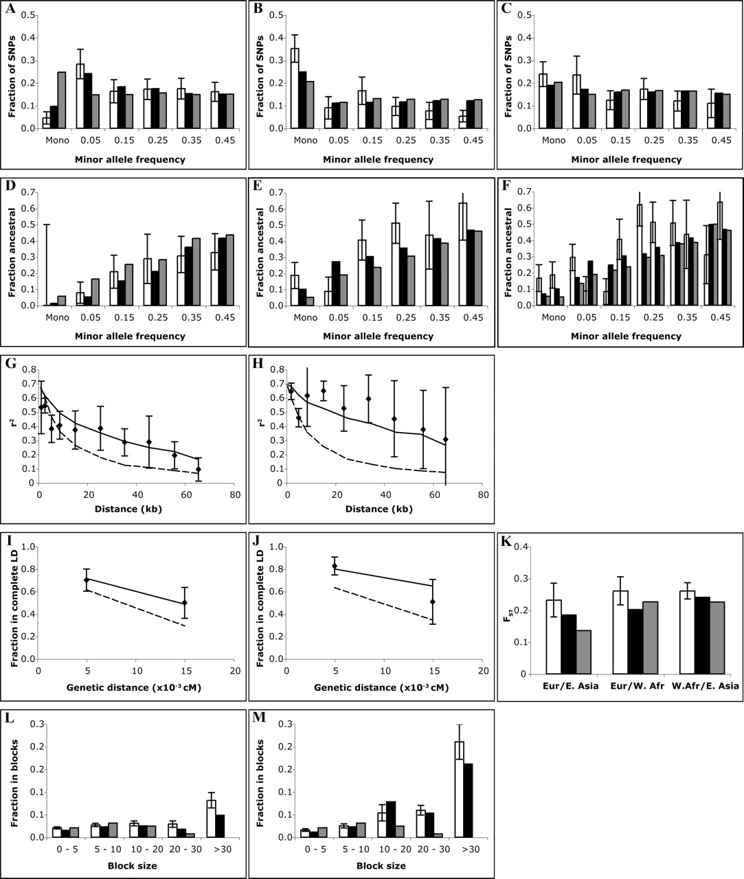 Comparison of best fit-model with empirical data, X-chromosome. Error bars represent one standard error. (A,B,C) Allele frequency spectrum. (White) Data; (black) best-fit model; (gray) standard neutral model. (A) West African. (B) East Asian. (C) European sample. (D,E,F) Fraction of alleles that are ancestral/chimpanzee, binned by allele frequency. (White) Data; (black) best-fit model; (gray) standard neutral model. (D) West African. (E) East Asian. (F) European. (G,H) Linkage disequilibrium (r2) versus physical distance. (Points) Data; (solid line) best-fit model; (dashed line) standard neutral model. (G) West African. (H) European. (East Asian omitted because of poor statistics.) (I,J) Fraction of marker pairs with perfect LD (D′ = 1.0) versus genetic distance. (I) West African. (J) European. (Points) Data; (solid line) best-fit model; (dashed line) standard neutral model. (East Asian omitted because of poor statistics.) (K) Genetic distance (FST). (White) Data; (black) best-fit model; (gray) standard neutral model. (L,M) Fraction of sequence in haplotype blocks of different sizes. (White) Data; (black) best-fit model; (gray) standard neutral model. (L) West African. (M) non-African (European + East Asian).