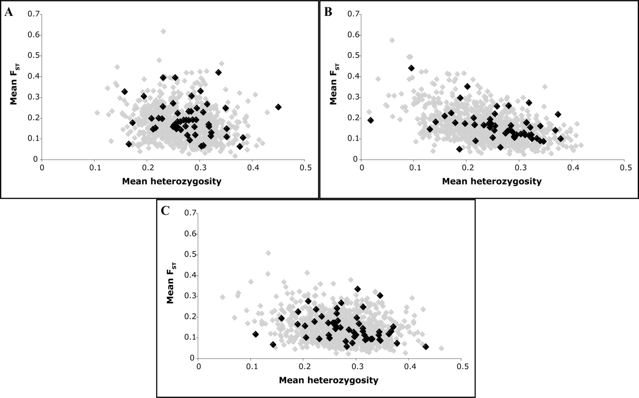 Comparison of best-fit model with data: 52 gene regions. Here 40 genes are genotyped in three populations; long genes were subdivided into smaller regions. The mean FST and heterozygosity are shown (black), and compared to the same measures for simulated data (gray); simulated regions were 120 kb long with 30 ± 10 SNPs per region. (A) Yoruba sample. (B) Chinese sample. (C) CEPH sample.
