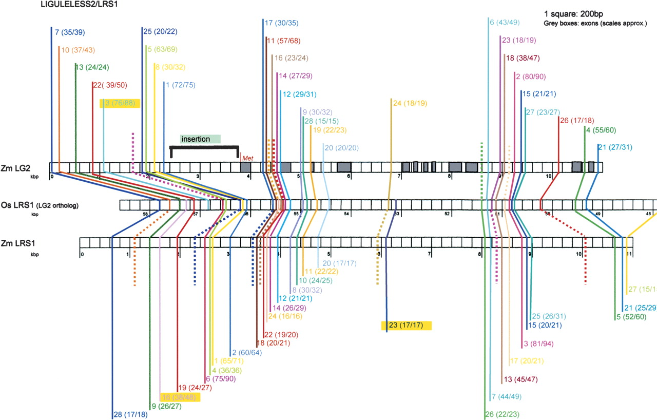 Two independent BLAST comparisons plotted coordinately: maize gene lg2 (AY180106 from a BAC) with its rice ortholog and maize gene lrs1 (AY180107 from a BAC) with the same rice ortholog (RGP PAC AP003287). The purple alignment line of lg2CNS17 represents how sequences near 5′ exons align. Exons were identified in genomic DNA for all three genes using the complete cDNA of lg2-mRNA (AF036949) and then masked. Bl2seq conditions were modified from those of Kaplinsky et al. (2002b). The BLAST result is represented by the solid, multicolored lines connecting the maize lg2 (Zm LG2) and rice lrs1 (Os LRS1) gene diagrams. The identity match is indicated parenthetically. Each color connects CNSs that are essentially the same. A broken line reflects a maize lg2-lrs1 CNS retention, but just below the 15/15 cutoff. Yellow highlighting denotes those rare CNSs that are fractionated. Fractionation at the DNA level could, hypothetically, explain subfunctionalization at the phenotypic level. An insertion into lg2 promoter is noted. Figure was reproduced with permission from the Genetics Society of America © 2004, from Langham et al. (2004).