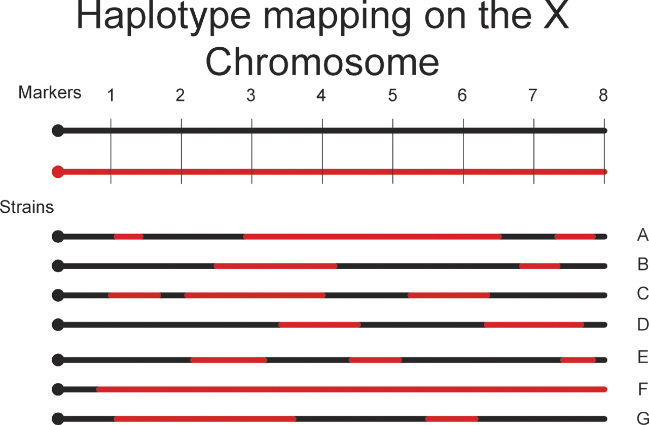 Haplotype block mapping of inbred strains to determine phenotype associated with red but not black chromosome.