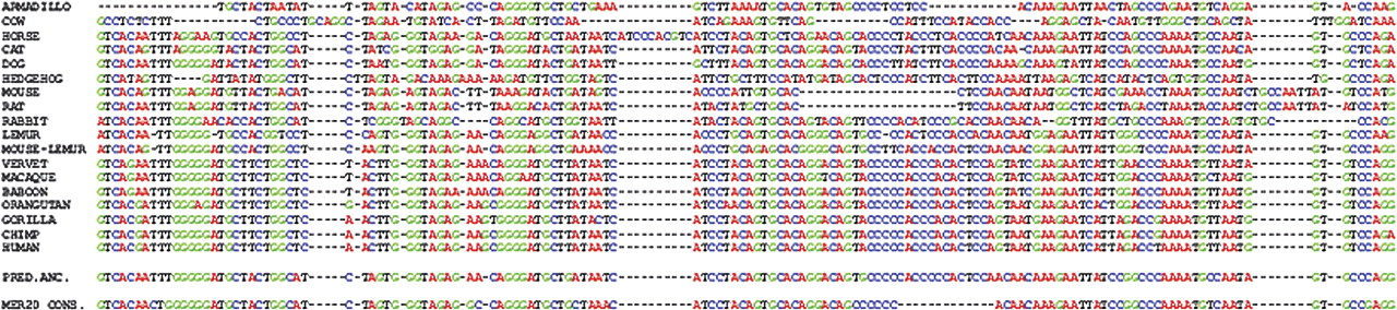 The recreation of an ancestral DNA sequence. This is an example based upon a MER20 retrotransposon. The sequence labeled “PRED.ANC.” at the bottom is the prediction of the ancestral MER20 sequence. Reproduced and modified with permission from Cold Spring Harbor Laboratory Press © 2004, Blanchette et al. (2004).