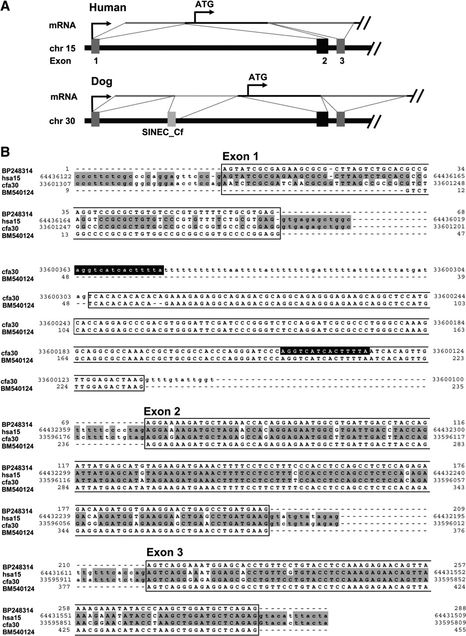 Splicing of a SINEC_Cf sequence into the canine mRNA for Tipin. (A) The 5′-end of the canine Tipin gene differs from that of human by inclusion of an additional untranslated exon that is derived from a SINEC_Cf. (B) Alignment of sequences representing the 5′-ends of Tipin mRNA from human (GenBank accession no. BP248314) and dog (BM540124) with genomic sequences from human (NCBI build 34) and dog (CanFam1). Nucleotide identity between the human and dog genomic sequences is shaded, exons are boxed, and intronic sequences are in lower case. Between exons 1 and 2, the dog genome contains a SINEC_Cf sequence that is flanked by a characteristic 15-bp duplication of the insertion site (white lettering on black). This element provides a 3′-splice acceptor site, and causes activation of a cryptic 5′-splice site downstream of the element, resulting in the incorporation of the SINEC_Cf sequence within the dog Tipin mRNA.
