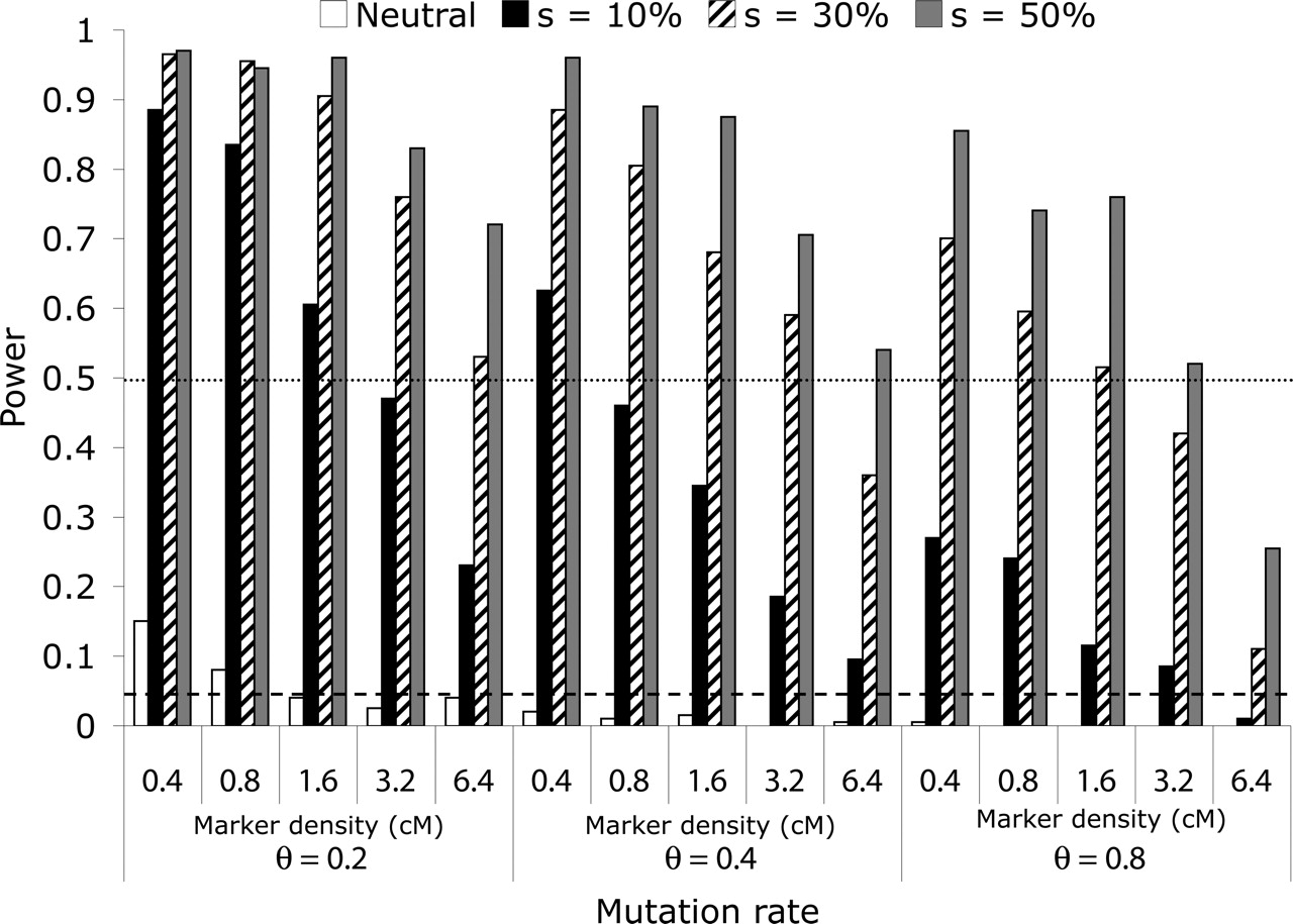 Summary of the power of the homozygosity statistics with varying values of recombination, selection, and mutation.