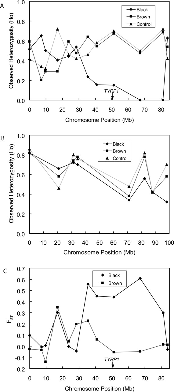 Microsatellite marker heterozygosity (A,B) and FST (C) values for the Large Munsterlander (Black), German Longhair (Brown), and control breeds. (A) Heterozygosity for markers on chromosome 11, the location of the TYRP1 gene, (B) heterozygosity for markers on control chromosome 5, (C) FST values for markers on chromosome 11.