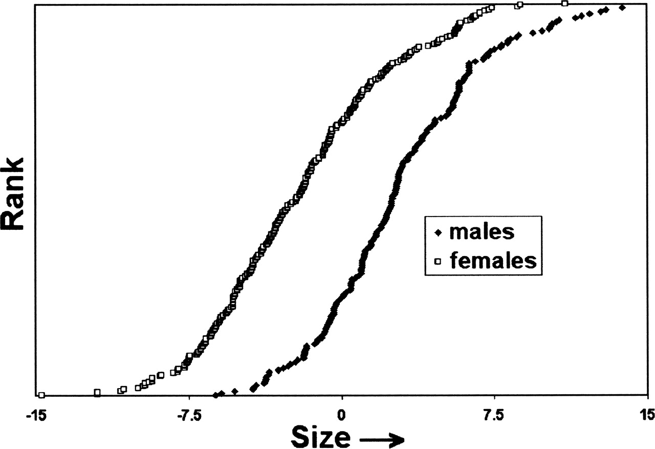 Size sexual dimorphism in the PW Dog. Forty two skeletal metrics were corrected to a mean of 0 and a standard deviation of 1. A matrix composed of the corrected skeletal metrics of 463 dogs was used to calculate the Principal Components of skeletal variation. Size is represented by values of PC1 calculated using the Pearson correlation option of XLSTAT (http://www.xlstat.com) for 42 skeletal metrics (males♦; females □).