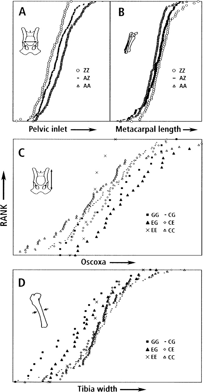 Trade-offs: Effects of genotypes on pelvis and limb bone metrics for PC2 QTLs associated with FH2269 and FH3324. The pelvic inlet (A; see Fig. 2, g) is compared to the length of the metacarpal bone (B); the oscoxa (C; see Fig. 2, f) is compared to the width of the tibia (D). In A and B, the genotypes were simplified by combining haplotypes (B + C = Z). In C and D, only six genotypes are shown: GG and EG are compared with EE, CG, CE, and CC. In each graph, dogs are ranked on the y-axis in order of increasing phenotype (x-axis), resulting in cumulative distributions of phenotypes for each genotype. Pedigree effects were removed by using jackknife techniques. Effects of PCs 1, 3, and 4 also were removed (see Chase et al. 2004). Thus, x-axis values are residuals.