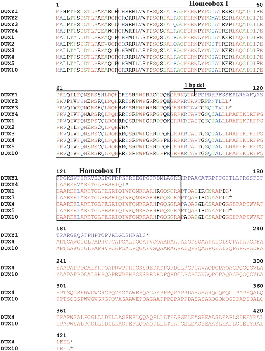 Comparison of predicted amino-acid sequence of cDNAs and paralogous genomic copies of double homeobox DUX-like genes. DUX1, DUX2, DUX3, DUX4, DUX5, and DUX10 represent human double homeobox-containing genes from 4q35. All genes consist only of a single exon. The color code corresponds to the CLUSTALW default for amino-acid sequence comparison. The boxes indicate the 60-amino-acid conserved homeodomain. Analogous to the DUX gene family member DUX2, none of the Y-derived DUX family members contain a complete copy of the second homeodomain (Homeobox II). The location of a 1-bp deletion in DUXY1 relative to all other family members is indicated, resulting in a frameshift and a C-terminally altered amino acid sequence (purple). We resequenced the DUXY1 copy from a PCR product amplified from BAC RP11-886I11 (AC134882) and a normal male individual and confirmed the accuracy of the 1-bp deletion. Black stars indicate stop codons.