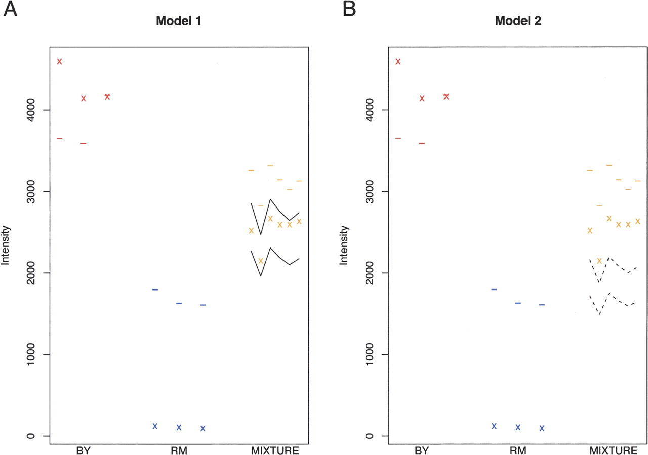 Examples illustrating the use of the 1:1 mixture to estimate the false positive and sensitivity of the method for detecting allele-specific expression. In each plot, the x's represent the observed intensities (I) and the dashes represent the expected intensities (Î) for a marker probe located in FKS1. Note that the probe represents a good marker, because the I/Î ratio is much greater in BY than in RM. For this transcript, the expected probe intensities for the three BY replicates are approximately twofold higher than in the three RM replicates, suggesting that the transcript is expressed at a higher level in BY. A 1:1 mixture of total mRNA from BY and RM would therefore contain approximately two times as much of the BY FKS1 allele as the RM allele. (A) Model 1 analyzes the false-positive rate. Here, the solid lines in the 1:1 mixture represent the predicted range for the observed probe signals under a model that correctly accounts for the twofold overabundance of BY allele. The observed signals from the 1:1 mixture replicates fall within this range, providing no evidence for deviation from the model. (B) Model 2 analyzes the power. Here, the dashed lines represent the predicted range of the observed probe signals under a model assuming equal expression of both alleles. All six observed intensity signals in the 1:1 mixture fall above this range, correctly revealing that the 1:1 mixture contains more BY allele than RM allele for this transcript.