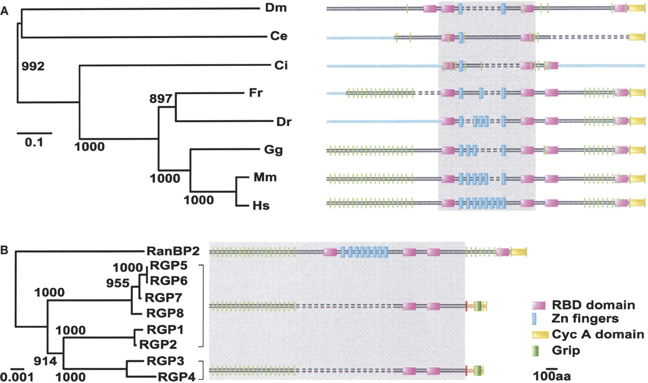 Conservation of the RanBP2 gene during metazoan evolution and its expansion in human. For each protein, the corresponding domain architecture is reported. The proteins are depicted reproducing the sequence alignments, the dashed bars representing the gaps in the alignments. The regions used to build the trees are highlighted in gray. (A) Phylogenetic tree of the RanBP2 orthologs in representatives of fully sequenced metazoan genomes. The light-blue bars represent protein regions that were not predictable because of gaps in the corresponding genomes. The exon-intron boundaries of the encoding genes are reported as vertical green bars. (Ce) Caenorhabditis elegans; (Ci) Ciona intestinalis; (Dm) Drosophila melanogaster; (Dr) Danio rerio; (Fr) Fugu rubripes; (Gg) Gallus gallus; (Hs) Homo sapiens; (Mm) Mus musculus.(B) Family tree of RanBP2 and RGP genes. The exon-intron boundaries of RanBP2-derived region (exons 1-20) are shown in green, those of GCC2-derived part (exons p-r) are in yellow. The RGP-specific intron, bearing the fusion between the RanBP2- and GCC2-derived regions, is depicted in red. The RGP regions encoded by the RanBP2-derived DNA are shown in black, the ones encoded by the GCC2-derived DNA in brown.