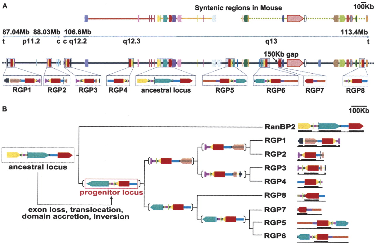 Evolutionary mechanism for the origin of the new gene family. The genes are shown as arrows with different colors associated with different genes. (Red) RanBP2; (yellow) GCC2; the RGP paralogs are shown in red for the RanBP2-derived region and in yellow for the GCC2-derived domain. The color scheme of the other genes as well as a larger version of the figure are given in Supplemental Figures S4 and S5, respectively. (A) Gene composition of the regions on human Chromosome 2 where the duplicated fragments containing the RGP paralogs are interspersed. The duplicated segments are highlighted in gray and enlarged in the lower boxes, in which similar intergenic sequences are also reported (see Methods for more details). The vertical dashed bars in both the segments containing RGP2 and RanBP2 indicate intergenic regions with no detectable intrachromosomal matches. The 3′-end of the RGP7 copy could not be assessed, as the human genome build 34 has a 150-kb gap in that region. The chromosomal bands, the region borders, and the direction to the centromere (c) and telomeres (t) are shown in the upper bar. The syntenic regions in mouse Chromosomes 10 (yellow), 17 (orange), and 2 (green) are also shown. (B) Family tree of the RGP and the RanBP2 paralogs, and putative mechanism for the formation of the RGP progenitor locus. At each branching point, the genomic structure of the putative progenitor is depicted. The ancestral locus, which contains RanBP2 and GCC2 and is syntenic in mouse, underwent several genetic rearrangements leading to the formation of the progenitor locus. The rearrangements included an inversion of the entire region, a loss of the 3′-exons from RanBP2, a partial deletion of the RanBP2 exon 20, and a translocation that places the 3′ noncoding region just downstream of the last four exons of the GCC2 duplicated gene. This event leads to the accretion of the GRIP domain. We assume that the progenitor locus already contained the newly formed RGP gene, as all the RGP duplicates contain the GRIP domain and a shorter version of RanBP2-derived exon 20. The bars reported under each of the duplicated segments indicate the presence of unambiguous expression data (ESTs and cDNAs) for the corresponding gene.