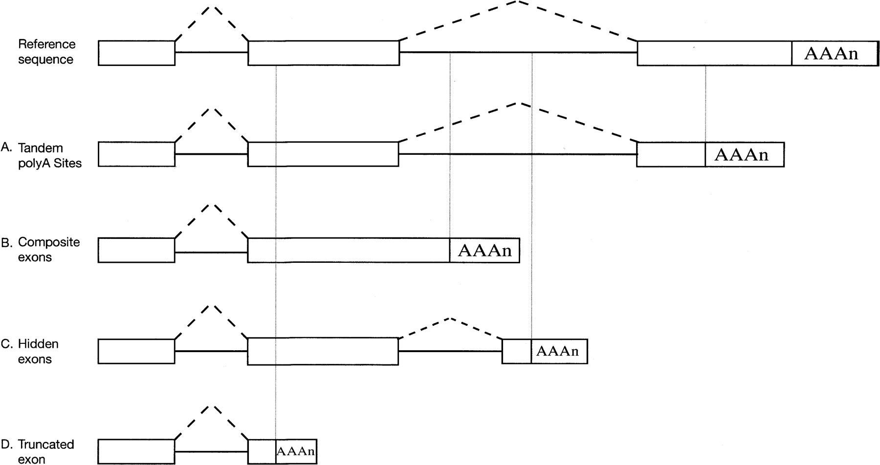 Four classes of patterns of alternative polyadenylation are shown together with the reference sequence. (A) Tandem poly(A) sites. (B) Composite exons. (C) Hidden exons. (D) Truncated exons.