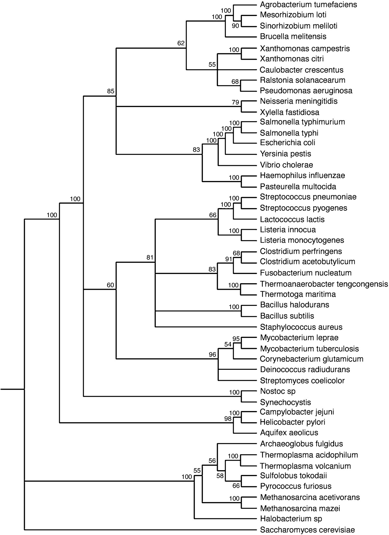 Neighbor-joining structural tree. This phylogeny is created using the neighbor-joining algorithm with the distances between organisms calculated as the total number of structural character differences between them. Bootstrap proportions are obtained from 500 replicates and are labeled as percentages near each internal node.