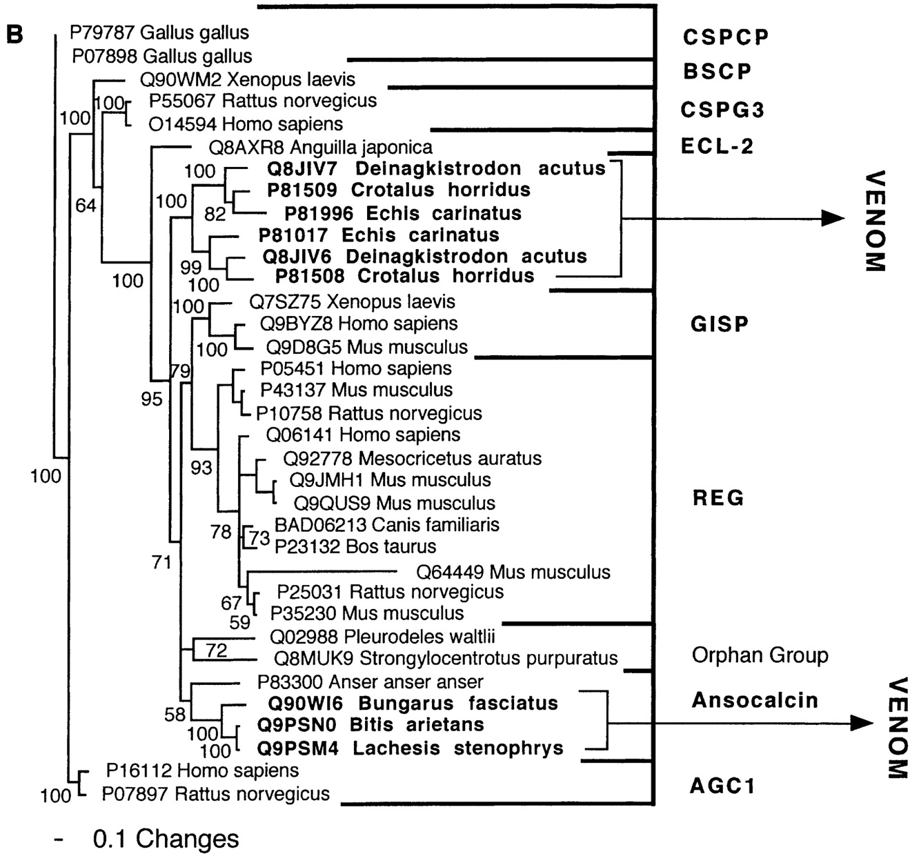 Bayesian analysis of representative (A) kallikrein and (B) lectin-related sequences. In order to minimize confusion, all sequences are referred to by their SWISS-PROT accession numbers (http://www.expasy.org/cgi-bin/sprot-search-ful). Snake venom sequences are in bold.