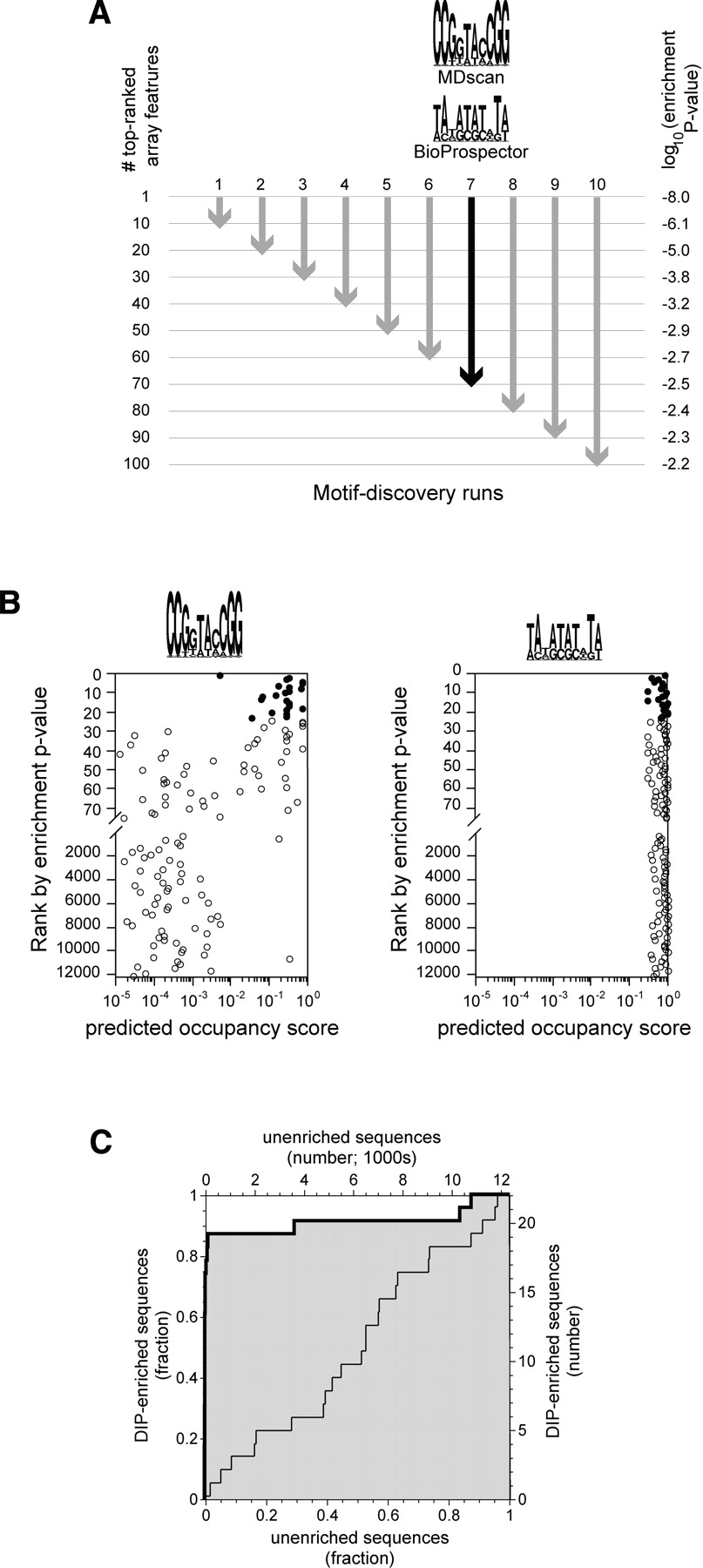 Motif discovery procedure. (A) For each of the two protein concentrations used, array features were ranked according to enrichment p-value. The sequences corresponding to the top 10, 20, 30,..., 100 features were used as input to BioProspector and MDscan. For each set of features, indicated by arrows, a single position weight matrix (PWM) was obtained from each of the two programs. For illustrative purposes, we show the two motifs discovered using the top 70 features from the 4-nM experiment (black arrow). This set is interesting because it provides a contrast between an excellent PWM (MDscan) and a poor one (Bioprospector, see B and C). Motifs are represented as sequence logos with the height of each column representing the information content of that position in the binding site (Schneider and Stephens 1990). (B) Computationally defined occupancy scores for the top 75 enriched array features and for every 200th feature thereafter (4-nM experiment; note the break in the y-axis and the change in scale). Occupancy scores were calculated using the two PWMs shown in A (Methods). Filled circles represent the 23 features that meet the 1% false discovery rate criterion for significance; all other features are shown as open circles. Only the PWM defined by MDscan (consensus sequence CCGGTACCGG) shows a marked tendency for the DIP-enriched sequences to have higher occupancy scores than the nonenriched sequences. (C) A Receiver Operator Characteristic (ROC) curve (Hanley and McNeil 1982) showing the power of a PWM to distinguish DIP-enriched sequences from nonenriched. The heavy line with the shaded area below is for the PWM defined by MDscan in A, while the light line is for the PWM defined by BioProspector. The curves are equivalent to a plot of the true positives vs. false positives for all possible values of the occupancy scores that, for a given PWM, would be used to predict enrichment (see text). Each of the 20 PWMs discovered at each protein concentration was judged based on the area under the ROC curve (ROC AUC) obtained using occupancy scores calculated with that PWM. A ROC AUC value of 0.5, corresponding to a diagonal ROC curve, is expected by chance, while a value of 1.0 indicates perfect predictive value for the motif. In this case, the BioProspector-defined motif shows no predictive power (ROC AUC = 0.49), while the MDscan motif does (ROC AUC = 0.91). Note that the ability of MDscan to outperform Bioprospector is specific to this example and does not occur in every case.