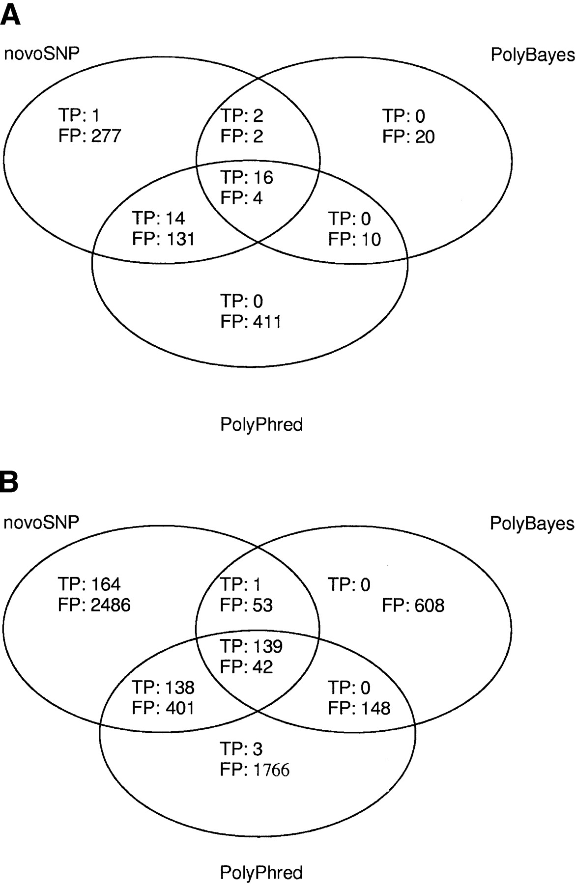 Venn diagrams representing the results of novoSNP, PolyPhred, and PolyBayes and their respective overlaps. The numbers represent the amount of true (TP) and false-positive (FP) SNPs detected by each program, regardless of their quality scores. (A) The SCN1A data. (B) The MAPT data.