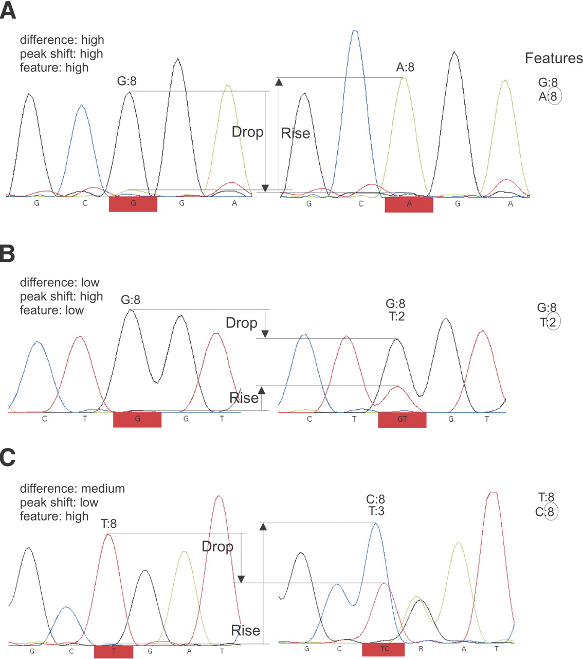 Illustration of the metrics used to calculate the novoSNP quality scores. (A) An easy to detect, homozygous SNP that scores high for all metrics. The features seen in the traces and their scores are listed on the right; the second best score (circled) represents the feature score for this position. (B) An example showing a relative small difference in peak area resulting in a low distance metric. The feature metric assigns a low score to the small secondary peak in the heterozygous sample. However, the compensation in the differences in peak area usually seen in true SNPs and measured by the peak shift metric is very clear: The drop in size in one color is almost just as large as the rise of the other color. (C) The peak shift is not always clearly present. In this example, the differences in peak size are large, but their absolute values not similar. The SNP will still be picked up by the other metrics.