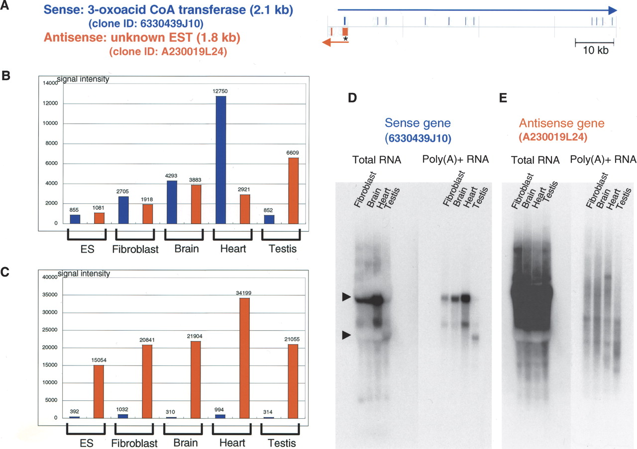 Microarray and Northern hybridization analysis of representative SAT pair. (A) Mapping patterns of sense (coding, 6330439J10) and antisense (noncoding, A230019L24) genes in the genome. The positions of exons are indicated as filled columns. The directions of transcription are indicated with arrows. In this figure, information associated with sense genes is shown in blue and that for antisense genes in red. (B) Microarray signal intensities obtained with samples labeled by oligo dT priming. (C) Microarray signal intensities obtained with samples labeled by random-nanomer priming. (D,E) Northern hybridization of sense (6330439J10) and antisense (A230019L24) genes. In each lane, 20 μg of total RNA or 1 μg of mRNA was loaded. In the Northern blot figures, the positions of 18S and 28S ribosomal RNA are indicated by arrowheads at the left edges of the blots.