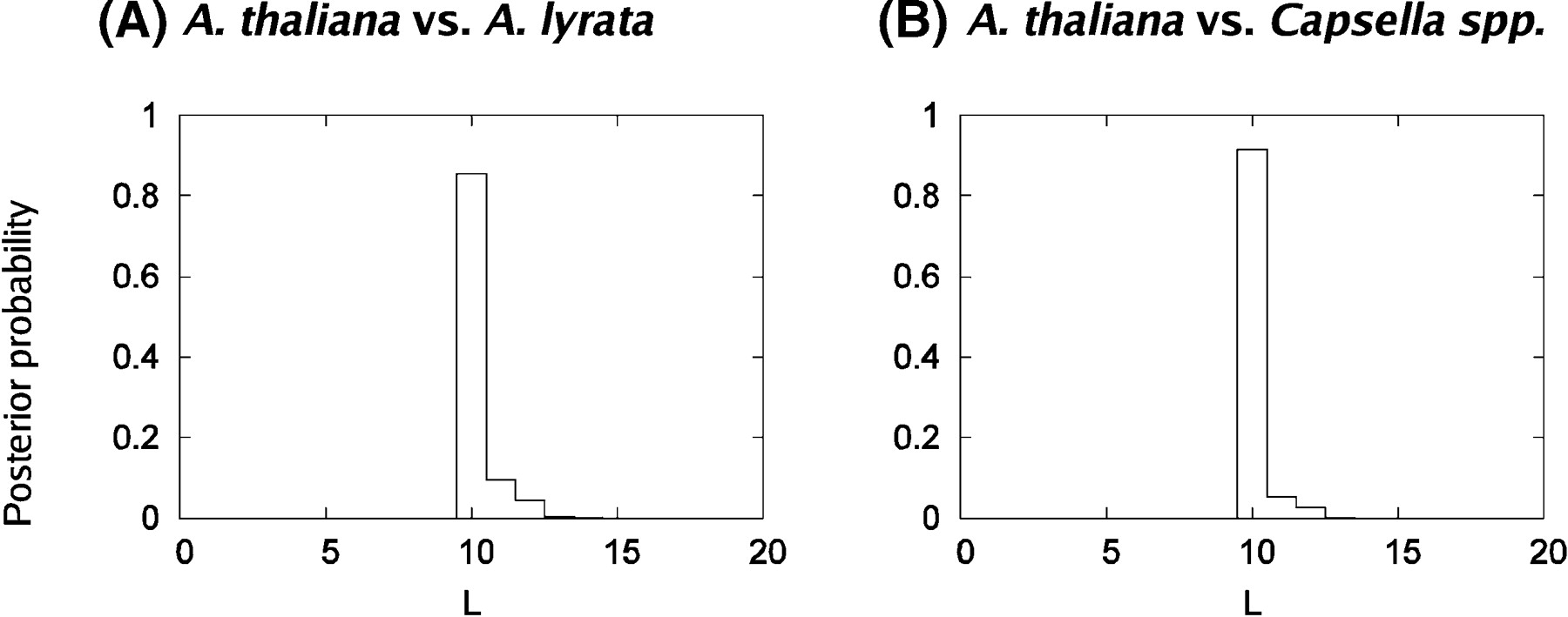 Posterior probability plots of A. thaliana–A. l. lyrata and A. thaliana–Capsella mapping data considering marker order only. Posterior probability plots generated from Bayesian analyses of mapping data accounting for marker orders without distances. (A) A. thaliana–A. l. lyrata comparison. (B) A. thaliana–Capsella comparison. x-axis: L = estimate of the total number of observable rearrangements; y-axis: Posterior probability estimate for the number of observable rearrangements.