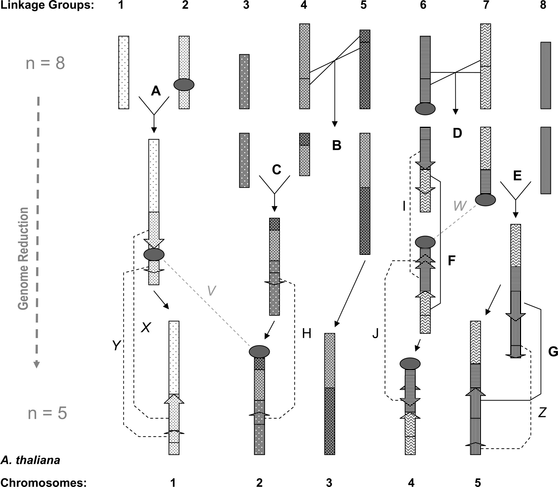 Genome reduction in A. thaliana: Parsimony solution of observable chromosomal rearrangement steps. Linkage groups 1–8 of A. l. lyrata, represented as patterned blocks, are shown across the top of the figure; A. thaliana chromosomes I–V at the bottom. A–G: Seven steps that are found to be in common between A. thaliana–A. l. lyrata and A. thaliana–Capsella spp. genome data; namely B and D, reciprocal translocations; A,C,E, fusion events; F and G, inversions. These seven steps could have occurred in any sequence during genome reduction in A. thaliana's evolutionary history. (H–J) Inversions seen only in the A. thaliana–A. l. lyrata comparative map. (V–Z) Rearrangements seen only in the A. thaliana–Capsella spp. comparative map, namely X,Y, Z, inversions and V and W, translocations of NORs (V and W not included in statistical analysis).