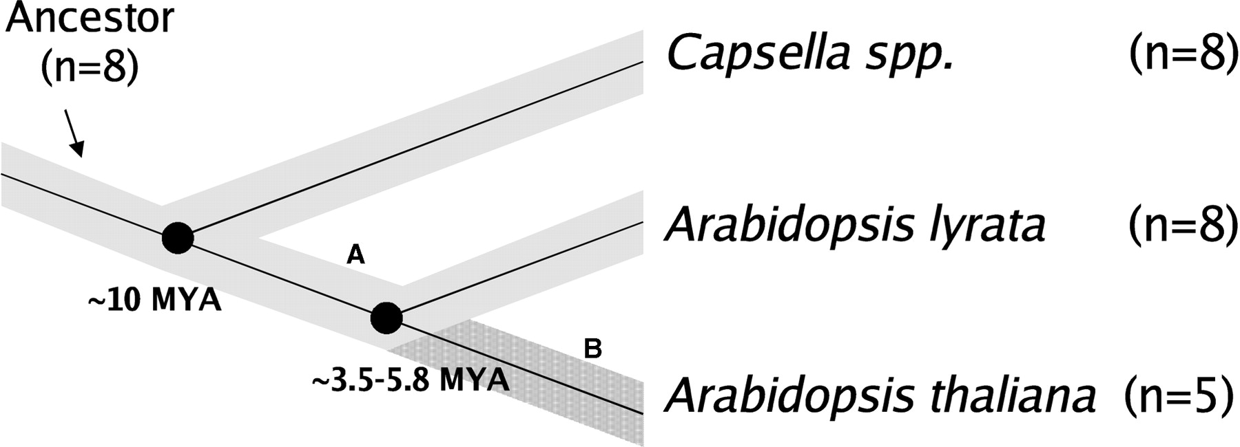Phylogenetic relationship between Arabidopsis spp. and Capsella spp. The phylogenetic relationship between A. thaliana, A. lyrata, and Capsella spp. is illustrated in this simple cartoon (modified from Koch et al. 1999). Extensive colinearity of mapping data suggests (A) conservation of genome arrangement since the ancestor of the tribe Sisymbrieae (n = 8) until these modern-day taxa with haploid complement of n = 8, and (B) the occurrence of most major genome rearrangement events in the last 5 Myr of A. thaliana's evolutionary history.