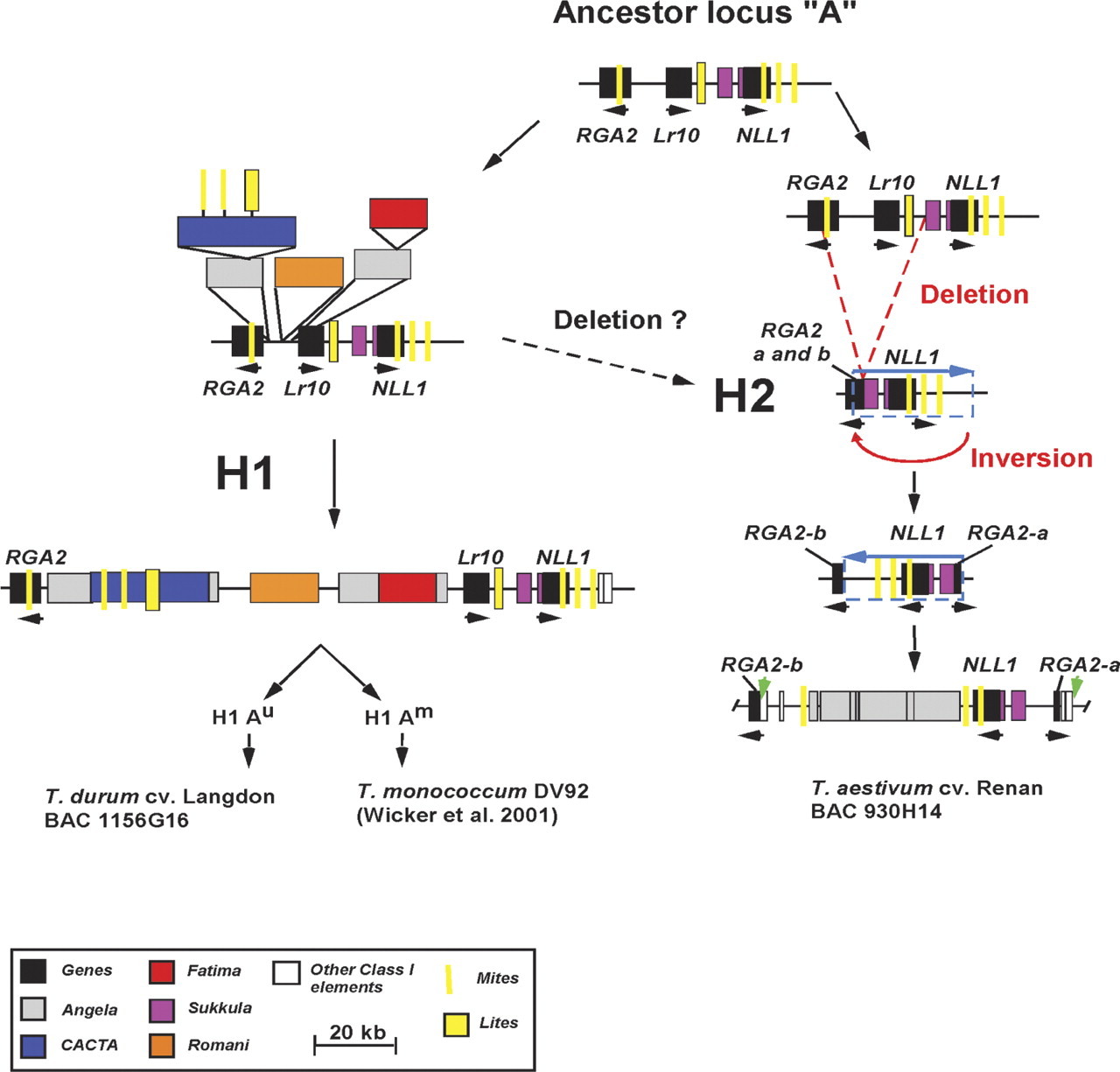 Model for the evolution of the H1 and H2 haplotypes at the Lr10 locus. Genes are indicated by black boxes. The short arrows located below the genes indicate the transcriptional orientation. Identified nested repetitive elements are shown by colored boxes. The evolution of the H1 haplotype is represented on the left side and the evolution of the H2 haplotype on the right side of the figure. The ancestor of the H1 haplotype comprises elements common to both T. monococcum and T. turgidum, and subsequent independent events of insertions/deletions occurred resulting in the modern loci. The H2 ancestor has undergone a deletion comprising Lr10 and the first exon of RGA2. The deletion is indicated by red dashed lines. An inversion indicated by a red arrow and delimited by blue arrows and a dashed rectangle also occurred in the H2 ancestor leading to a disruption of RGA2 that is at the origin of the modern T. aestivum sequence. Green arrows indicate the (TA) repeats possibly involved in the sequence inversion.