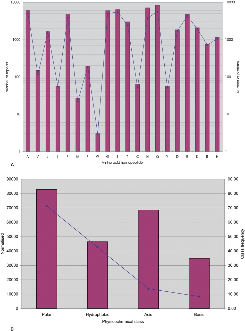Distribution of RCPs in GENPEPT. (A) The distribution of the RCPs in GENPEPT and the total number of repeats in GENPEPT. The bars represent the total number of repeats and the solid diamonds the number of RCPs. (B) Distribution of the repeats based on physicochemical class (polar, hydrophobic, acidic, and basic). Red bars represent the number of repeats for the amino acid class normalized for the amino acid frequencies in GENPEPT for that amino acid class (i.e., number of repeats in class X/[amino acid frequency for class X, not including the RCPs]). The solid blue diamonds represent frequency of the amino acid class in the RCPs.