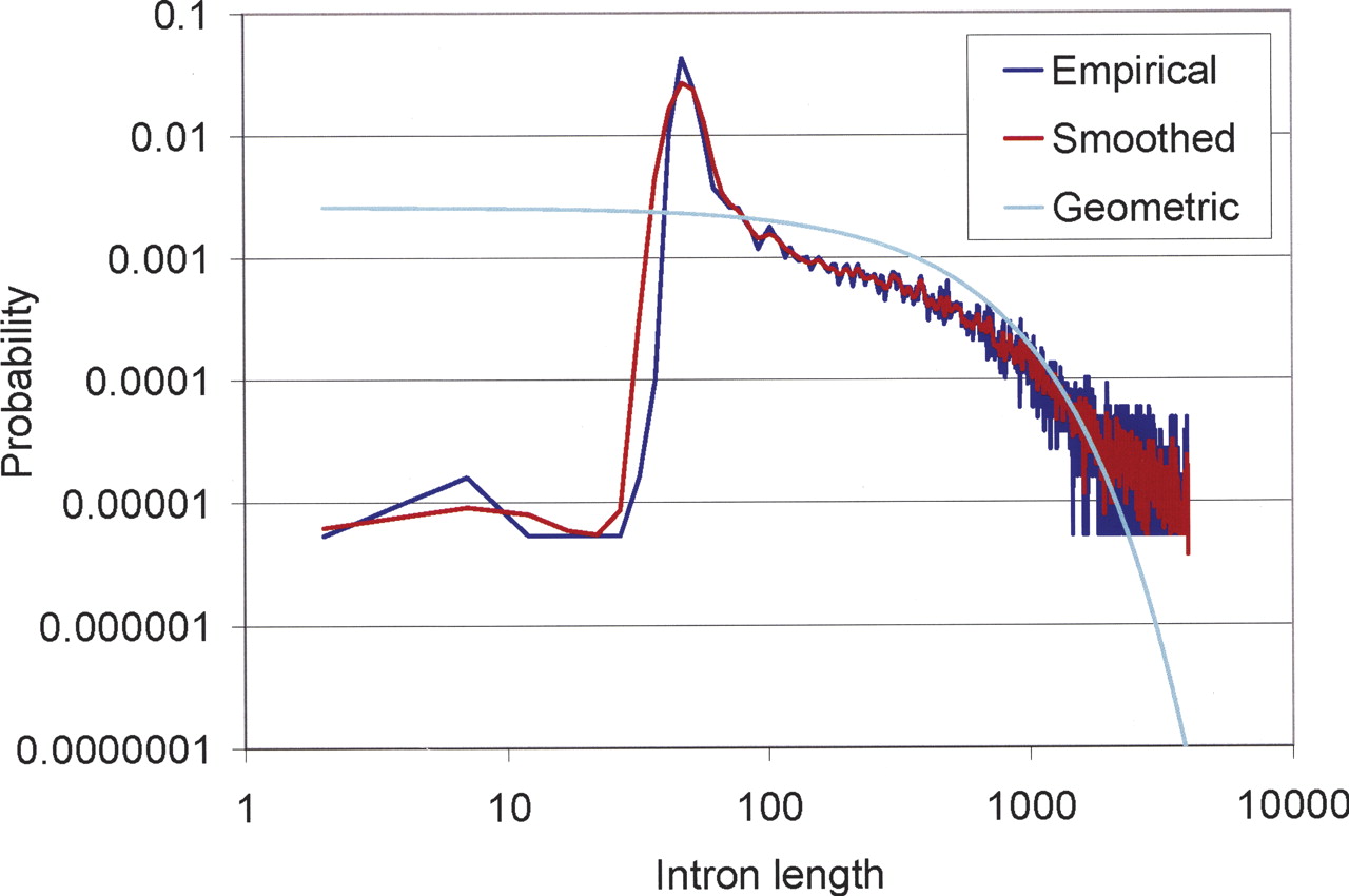 Empirical, smoothed empirical, and geometric intron length distributions up to 4000 nt, on a log–log scale. The smoothed empirical length distribution is very close to the distribution observed in the 3889 fully confirmed genes of WS100. The geometric distribution, in contrast, assigns far too much probability to very short introns, too little to introns of the most common lengths, too much to introns between 100 and 1000 nt, and too little to introns longer than 2000 nt.